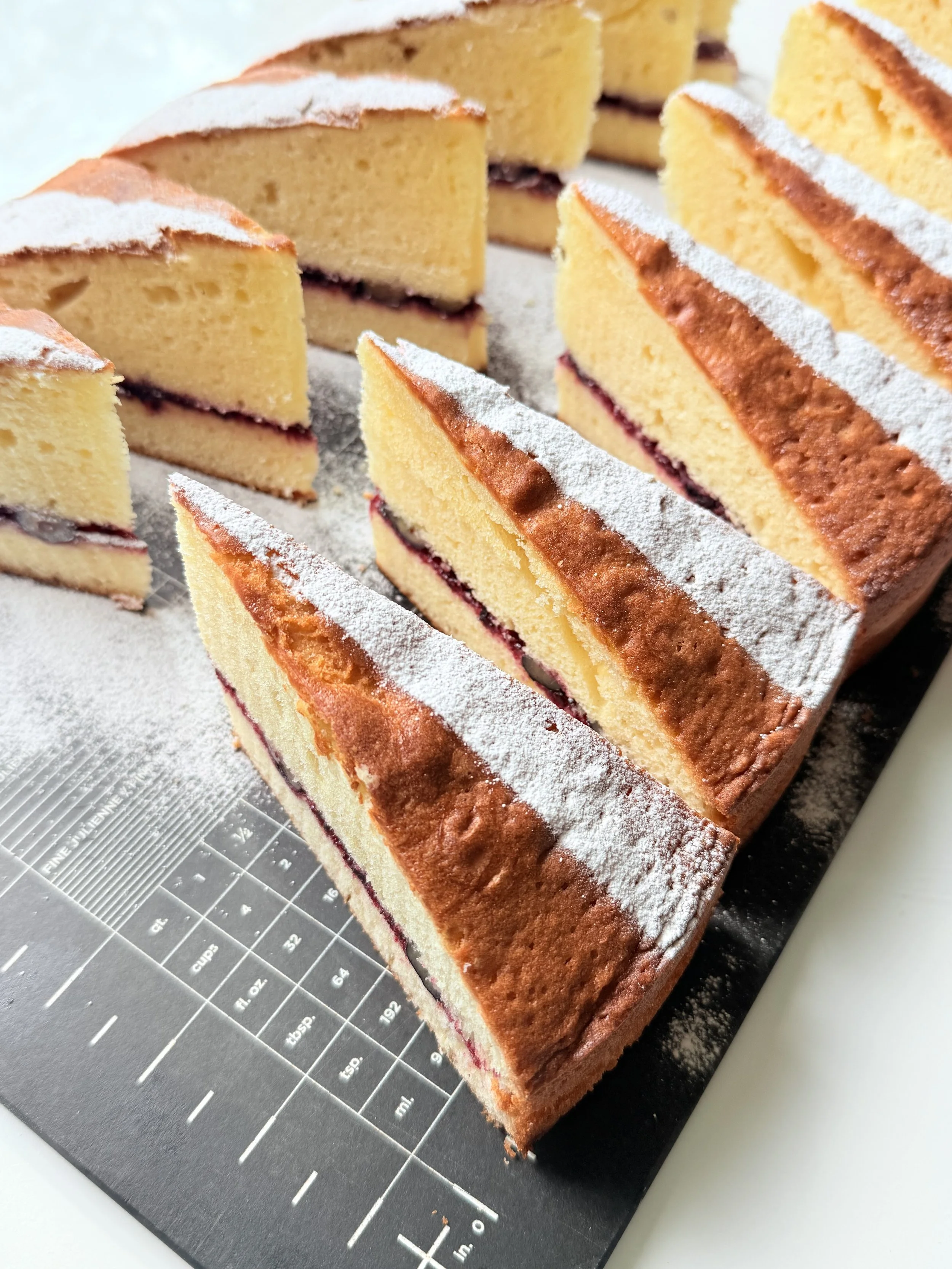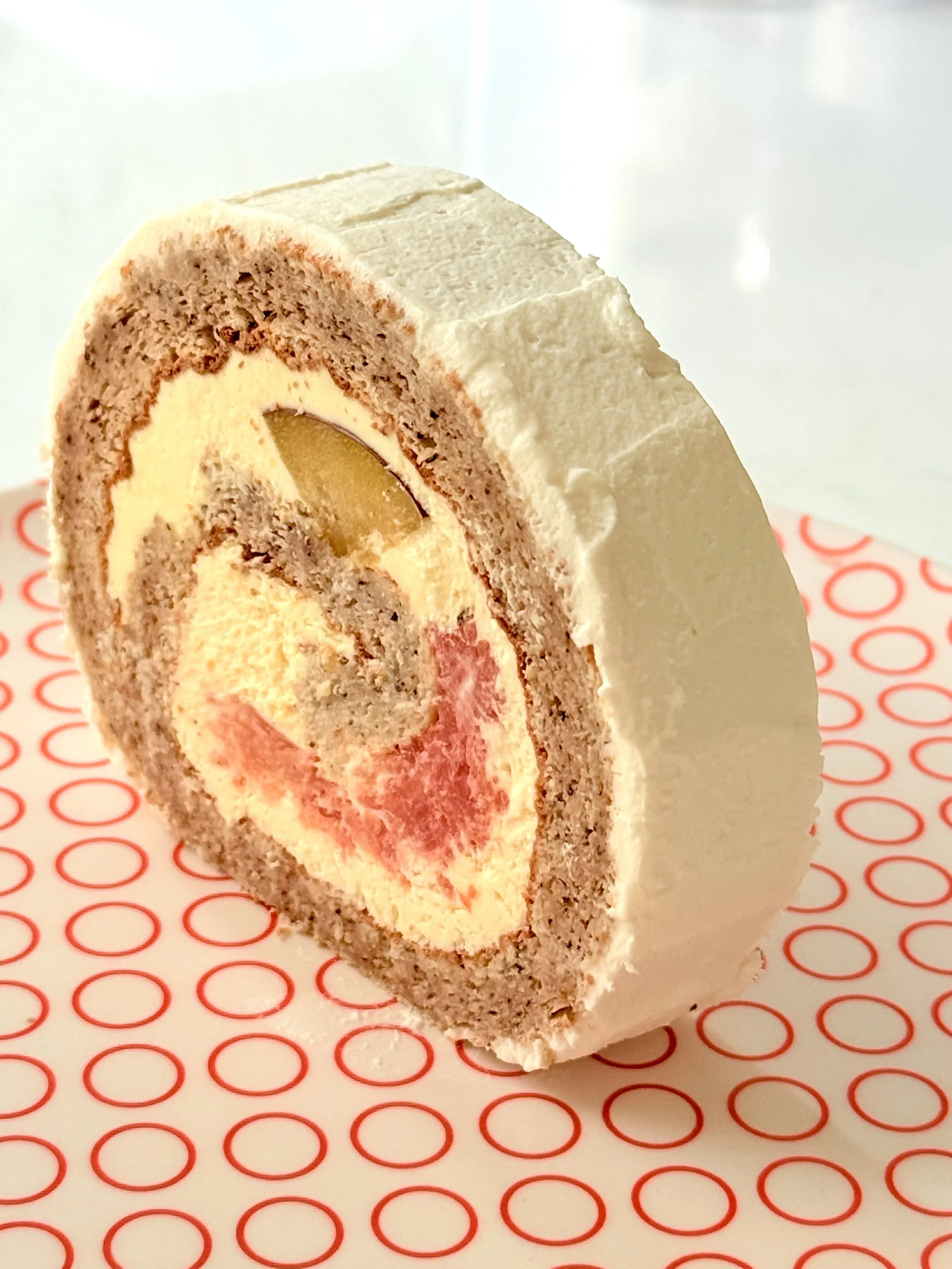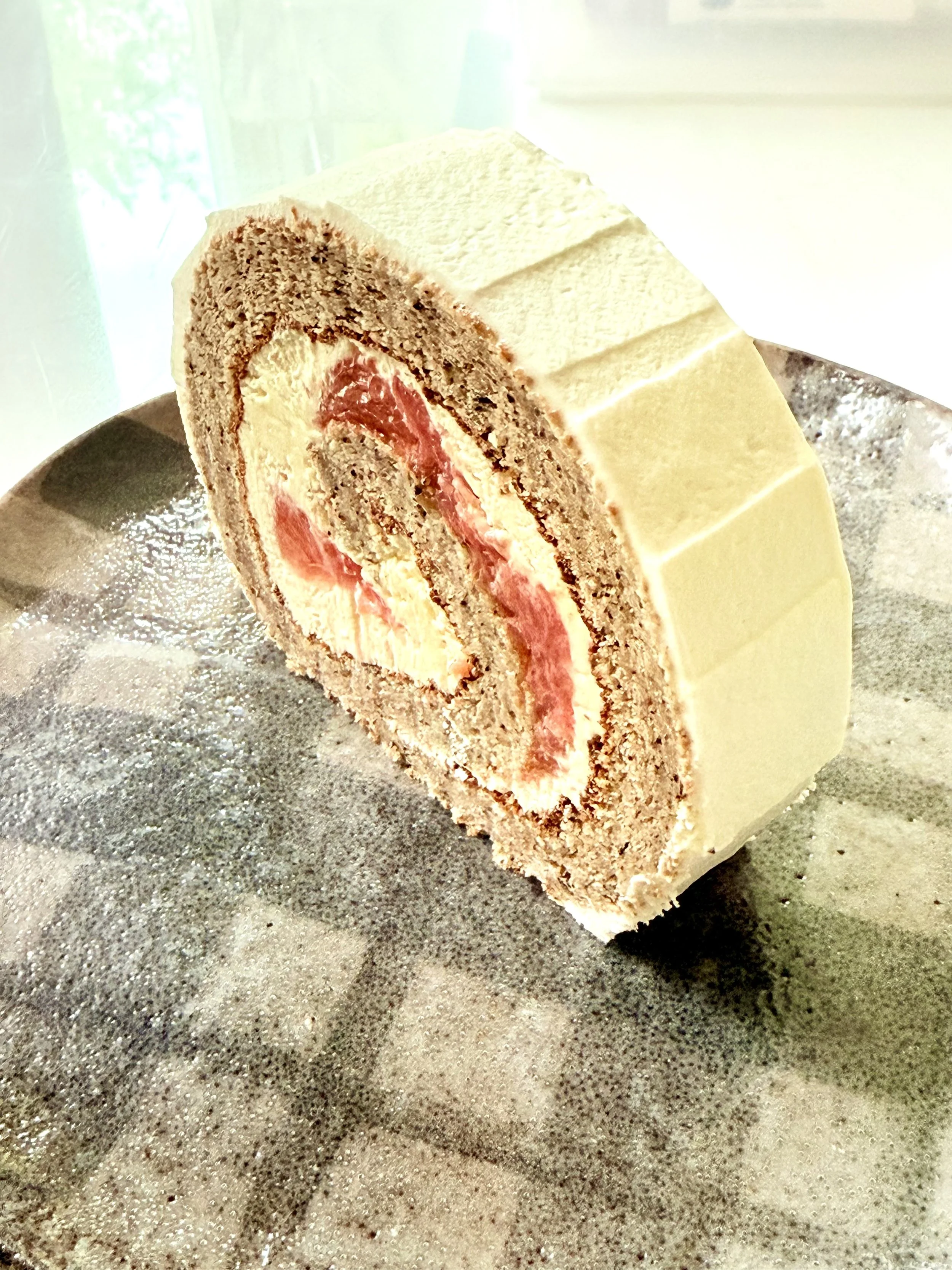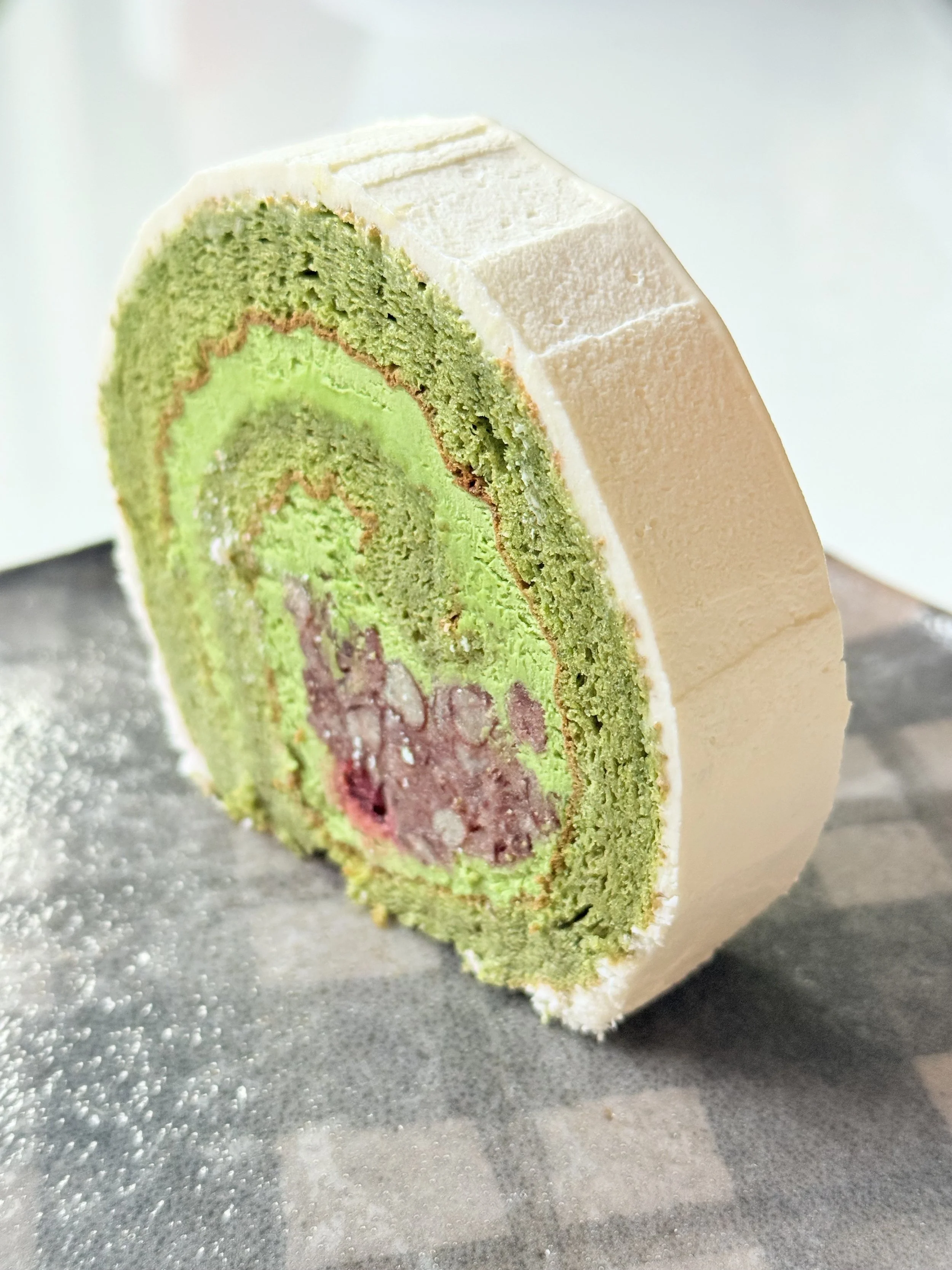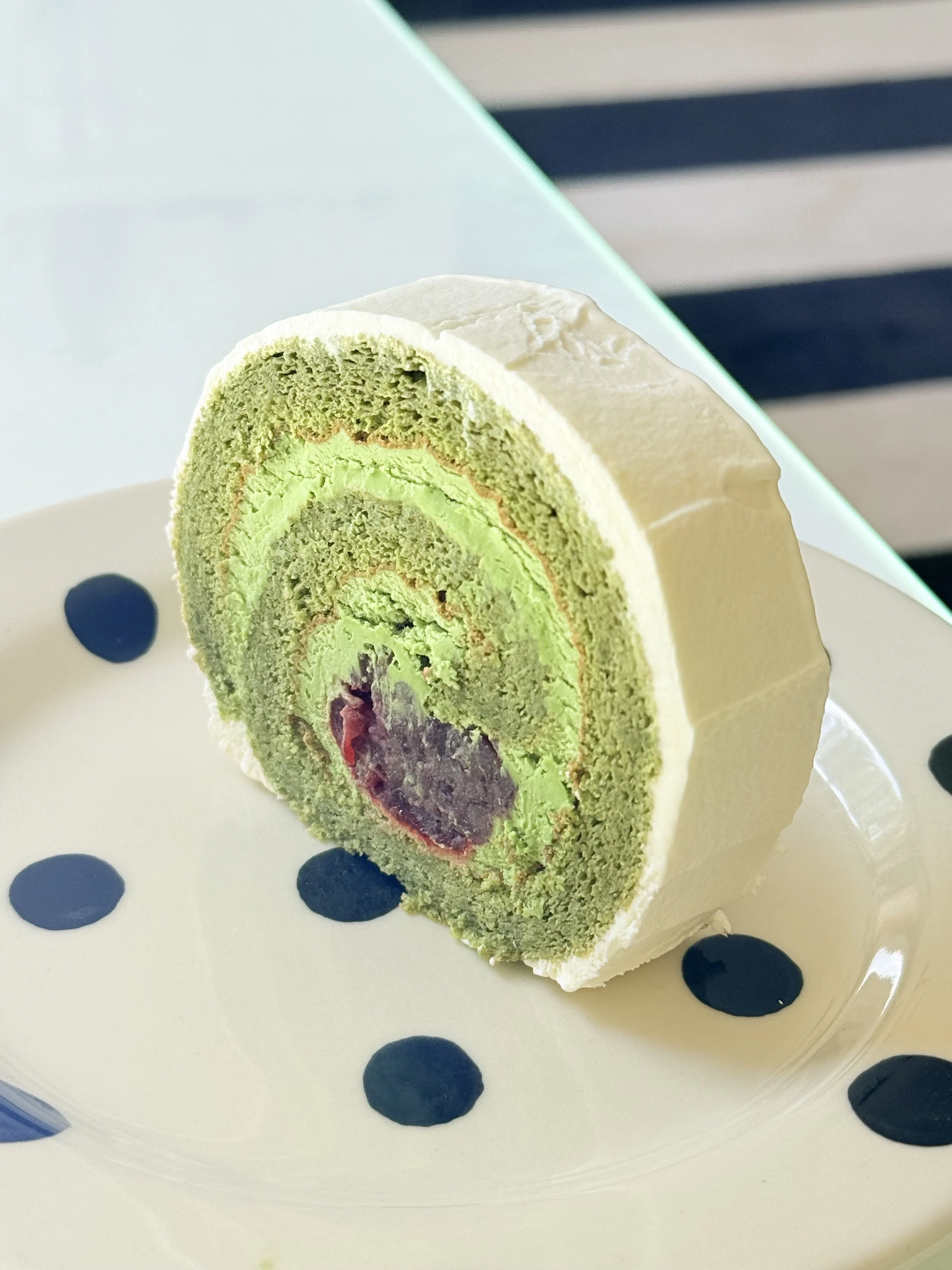 Light and fluffy matcha Swiss roll filled with sweetened azuki beans and tart sour cherry compote. A delicate balance of earthy tea flavor and fruity sweetness