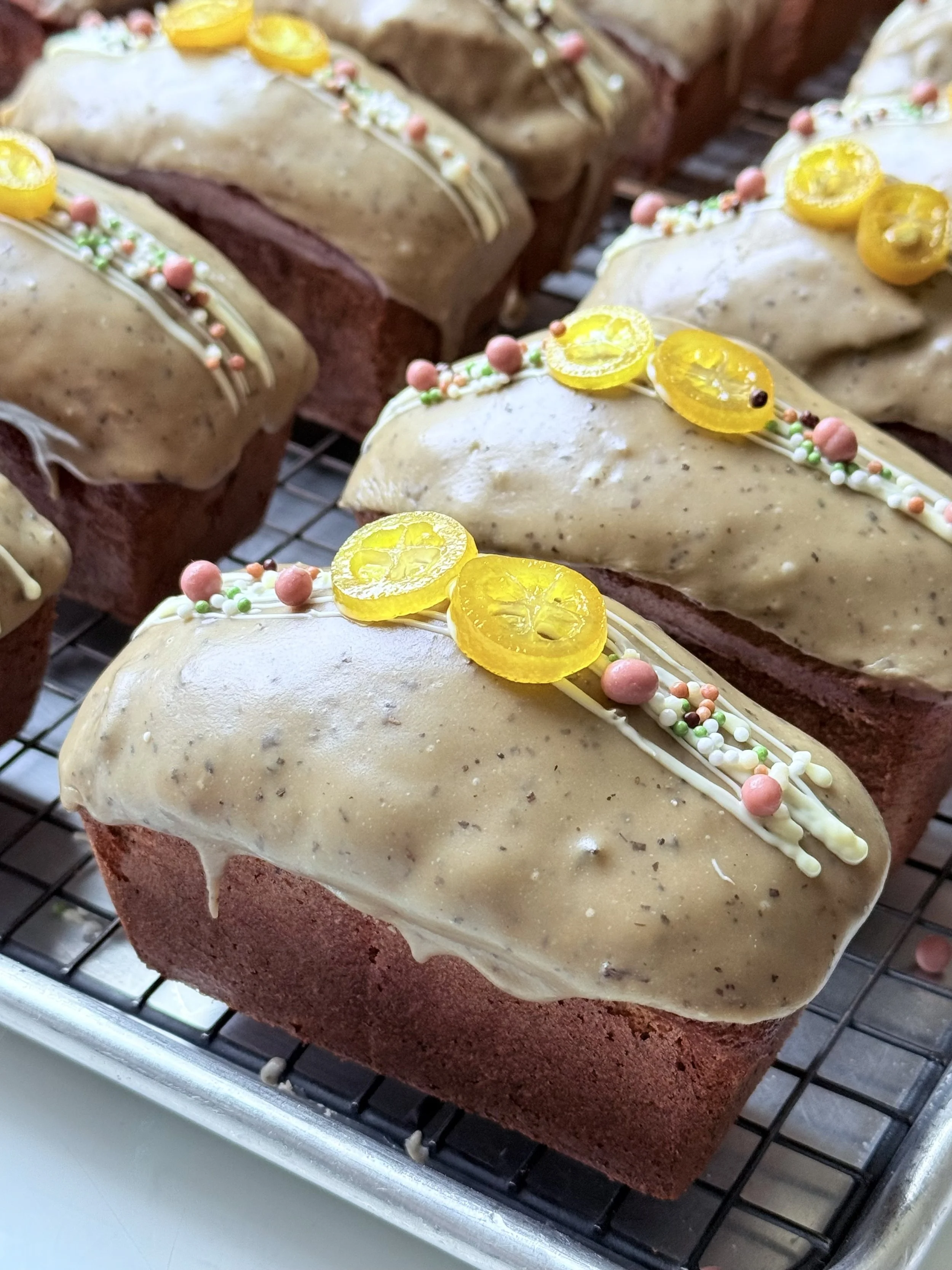 Moist and flavorful matcha pound cake layered with smooth pumpkin paste, sweetened azuki beans, and finished with a delicate pumpkin icing.