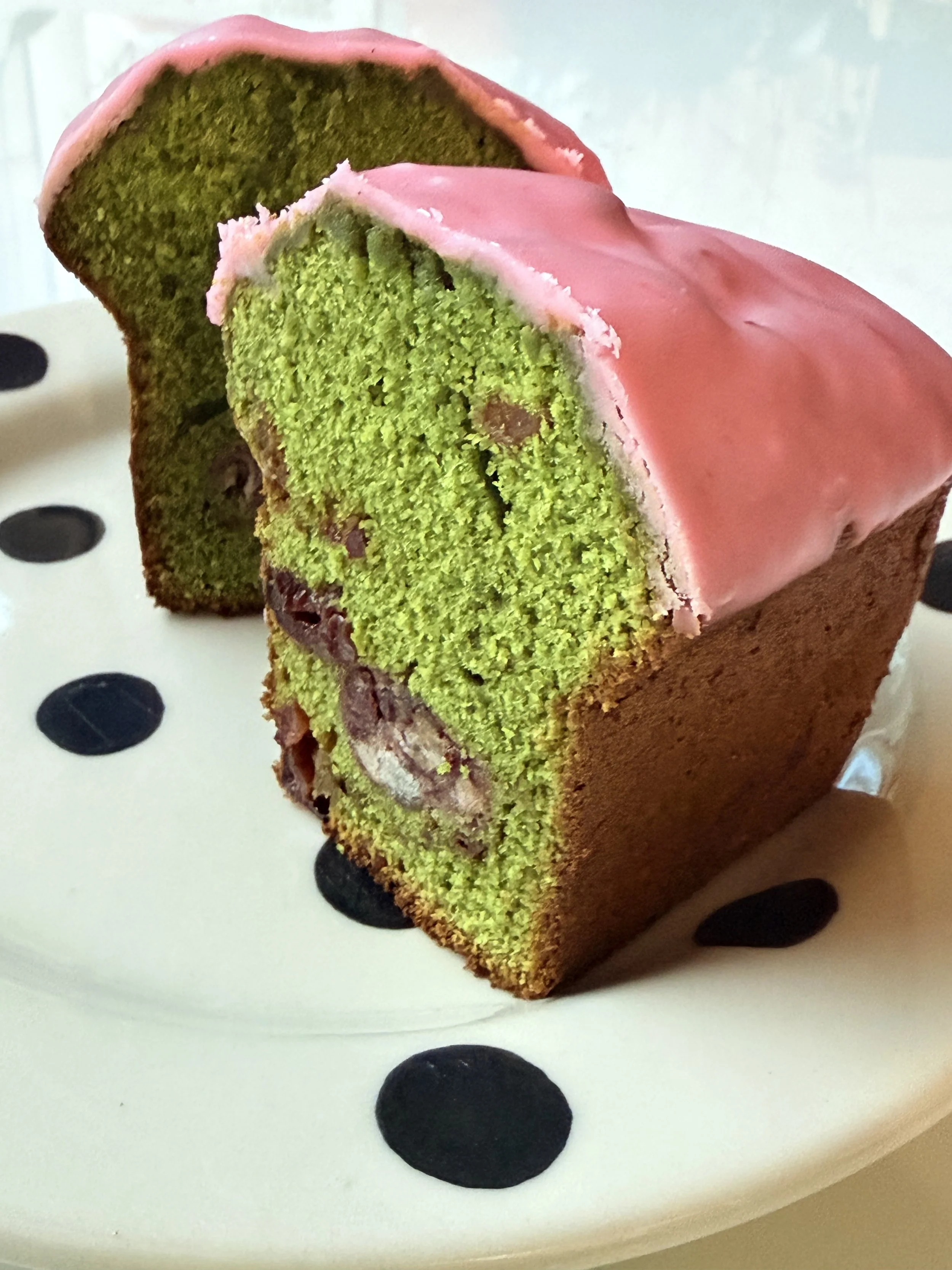 MATCHA POUND CAKE WITH PUMPKIN PASTE, SWEETENED AZUKI AND PUMPKIN ICING