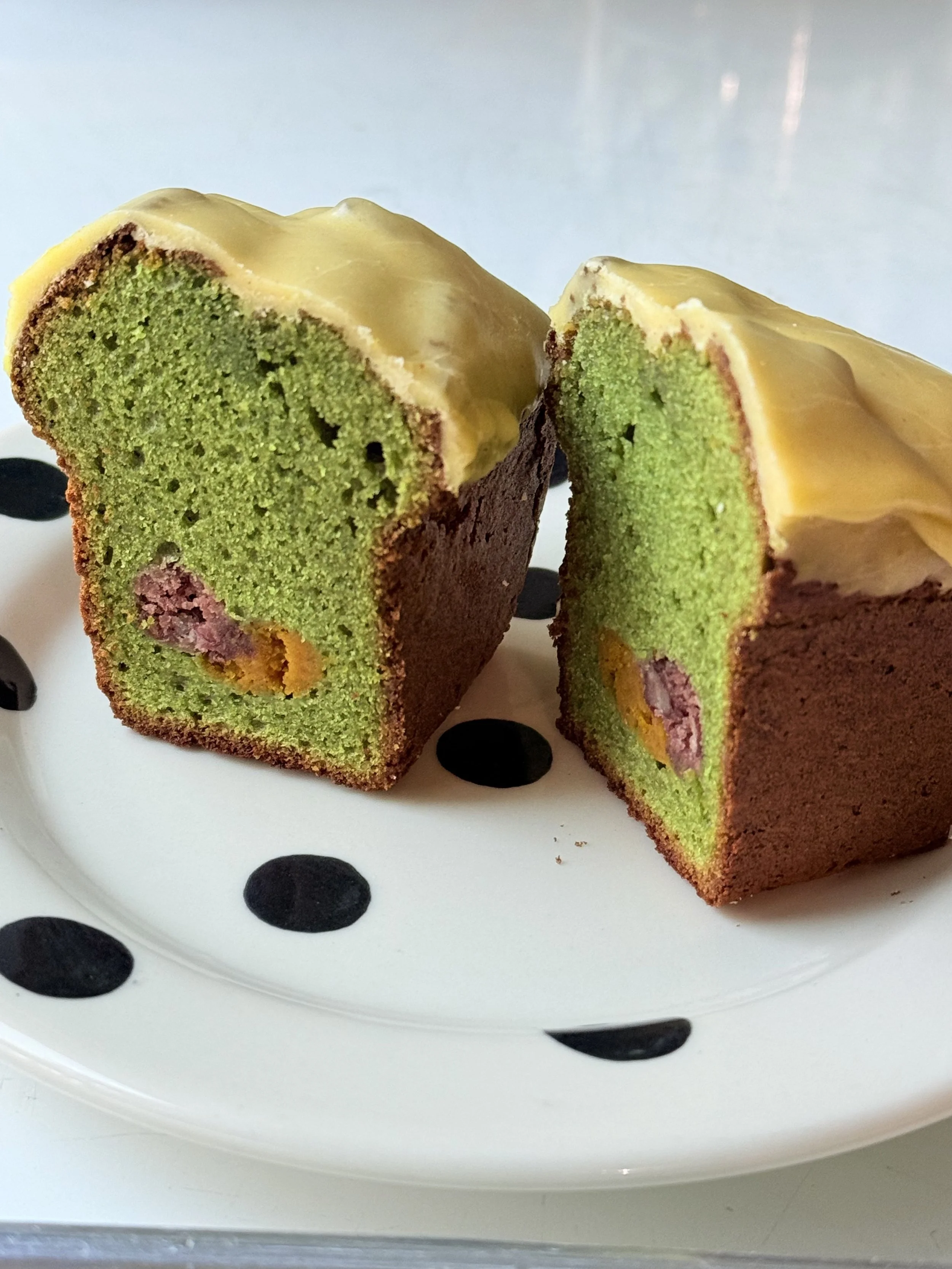 MATCHA POUND CAKE WITH PUMPKIN PASTE, SWEETENED AZUKI AND PUMPKIN ICING