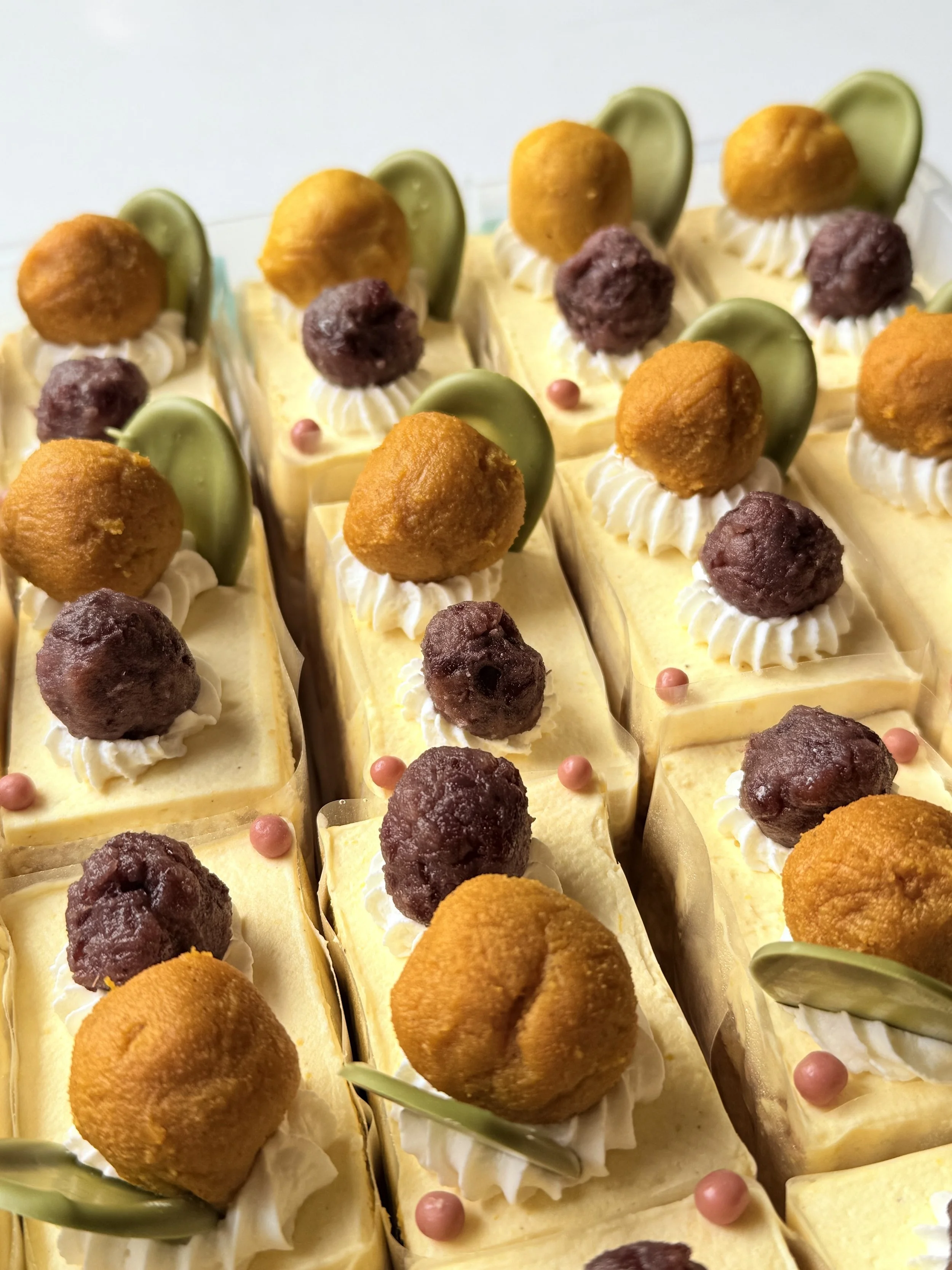 MAPLE SHORTCAKE WITH JAPANESE PUMPKIN AND SWEETENED AZUKI BEAN A cozy, autumn-inspired treat with soft cake, smooth pumpkin, and sweet azuki beans.