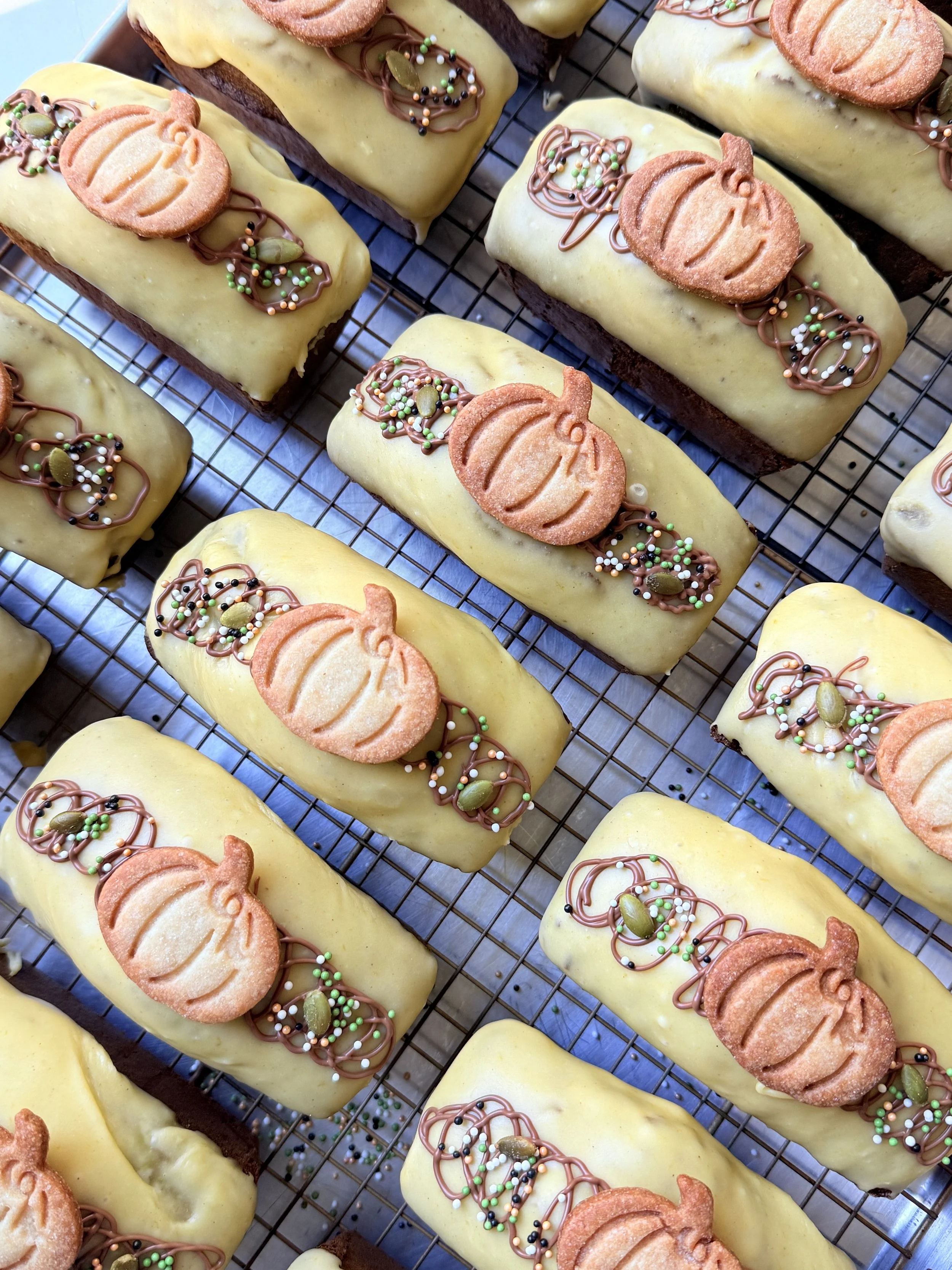 Moist and flavorful matcha pound cake layered with smooth pumpkin paste, sweetened azuki beans, and finished with a delicate pumpkin icing.