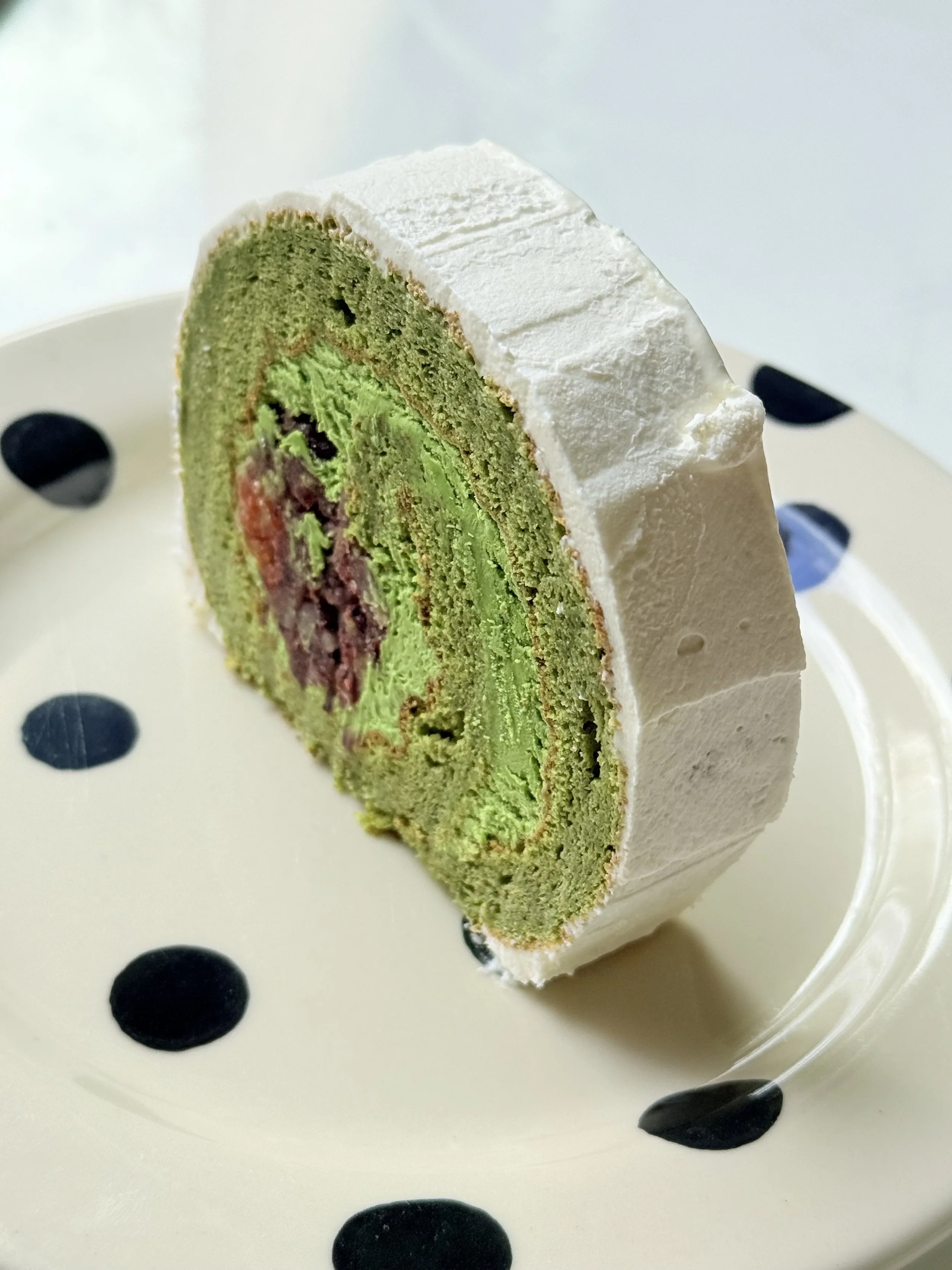 Light and fluffy matcha Swiss roll filled with sweetened azuki beans and tart sour cherry compote. A delicate balance of earthy tea flavor and fruity sweetness