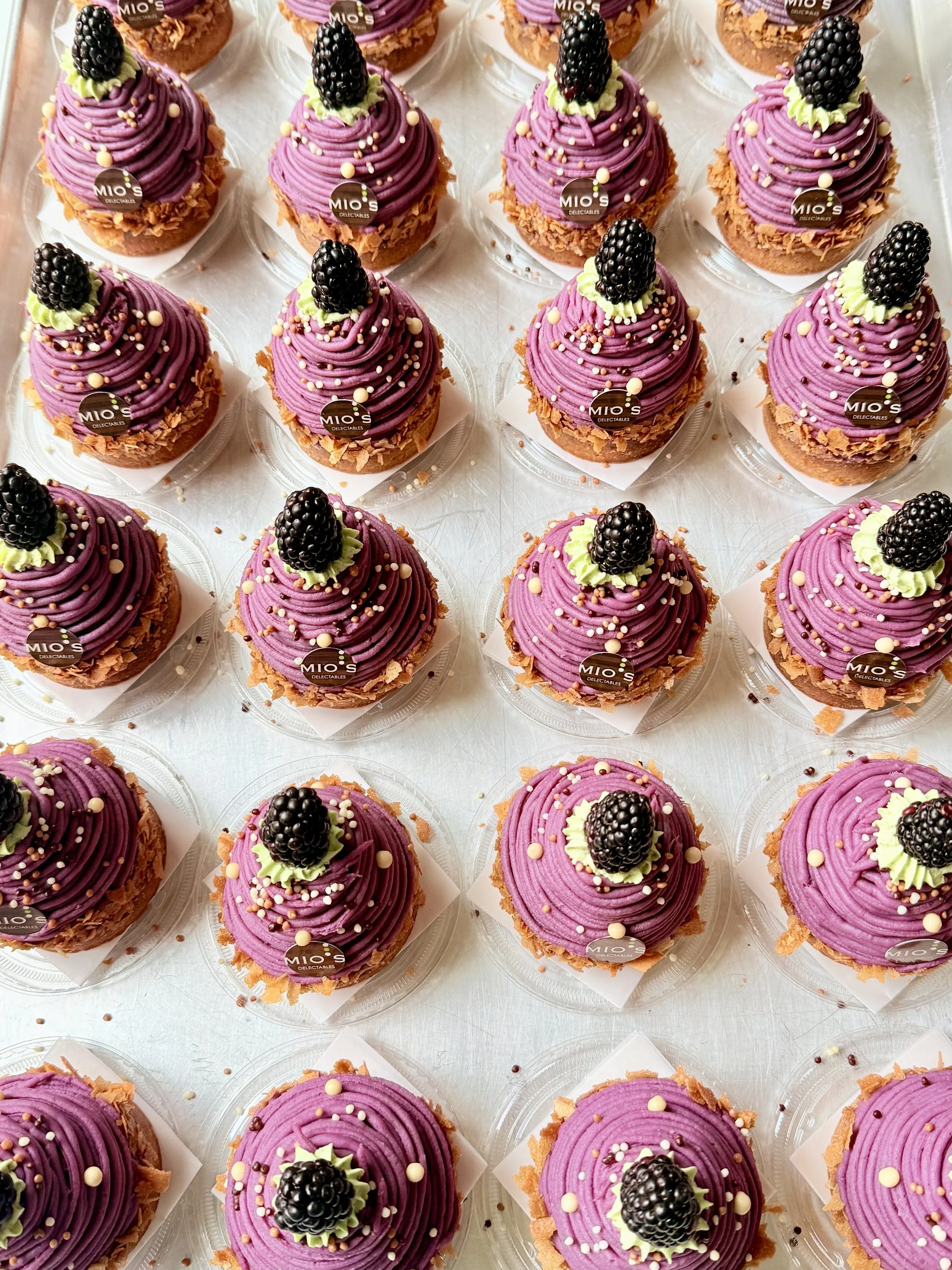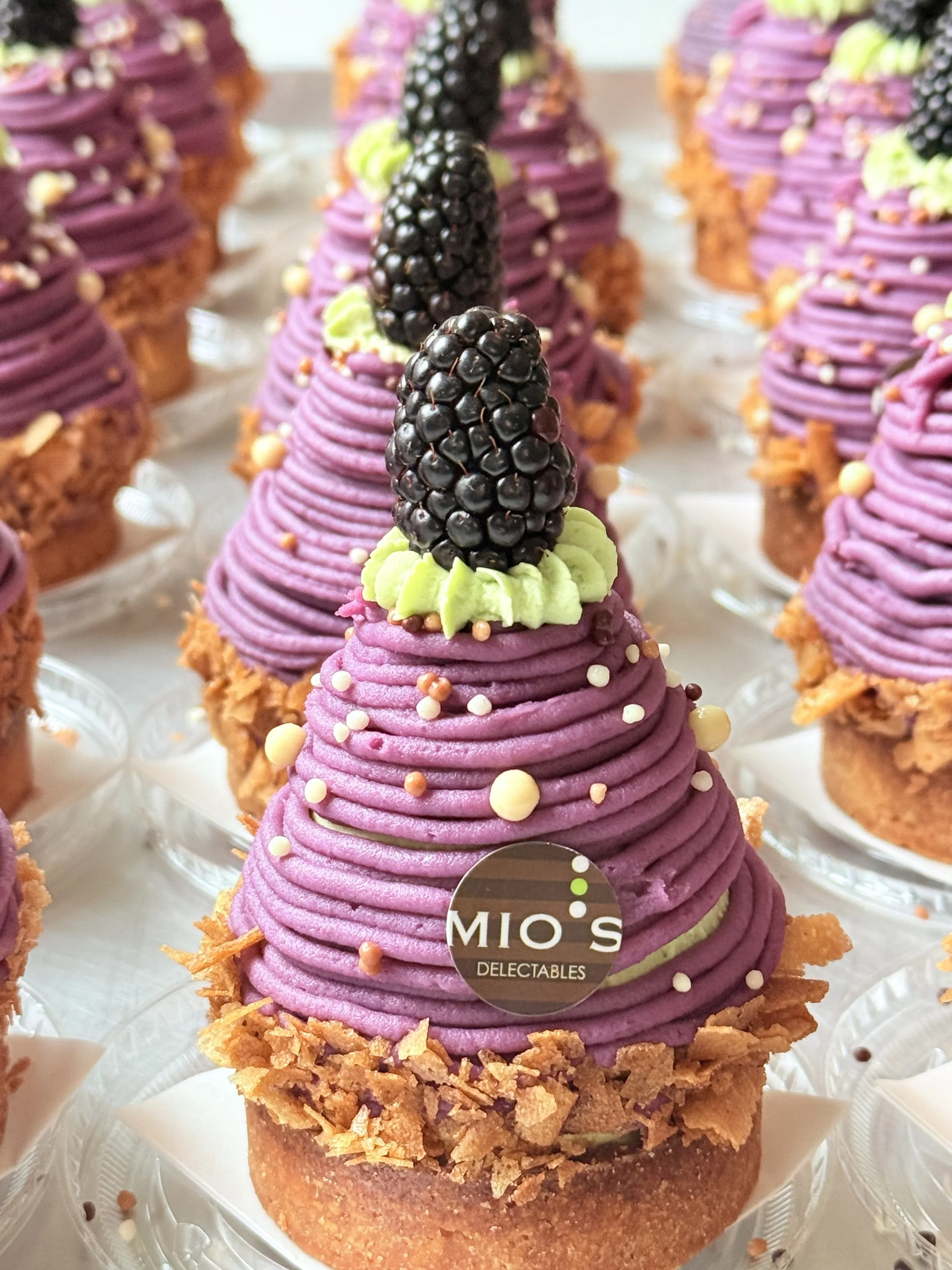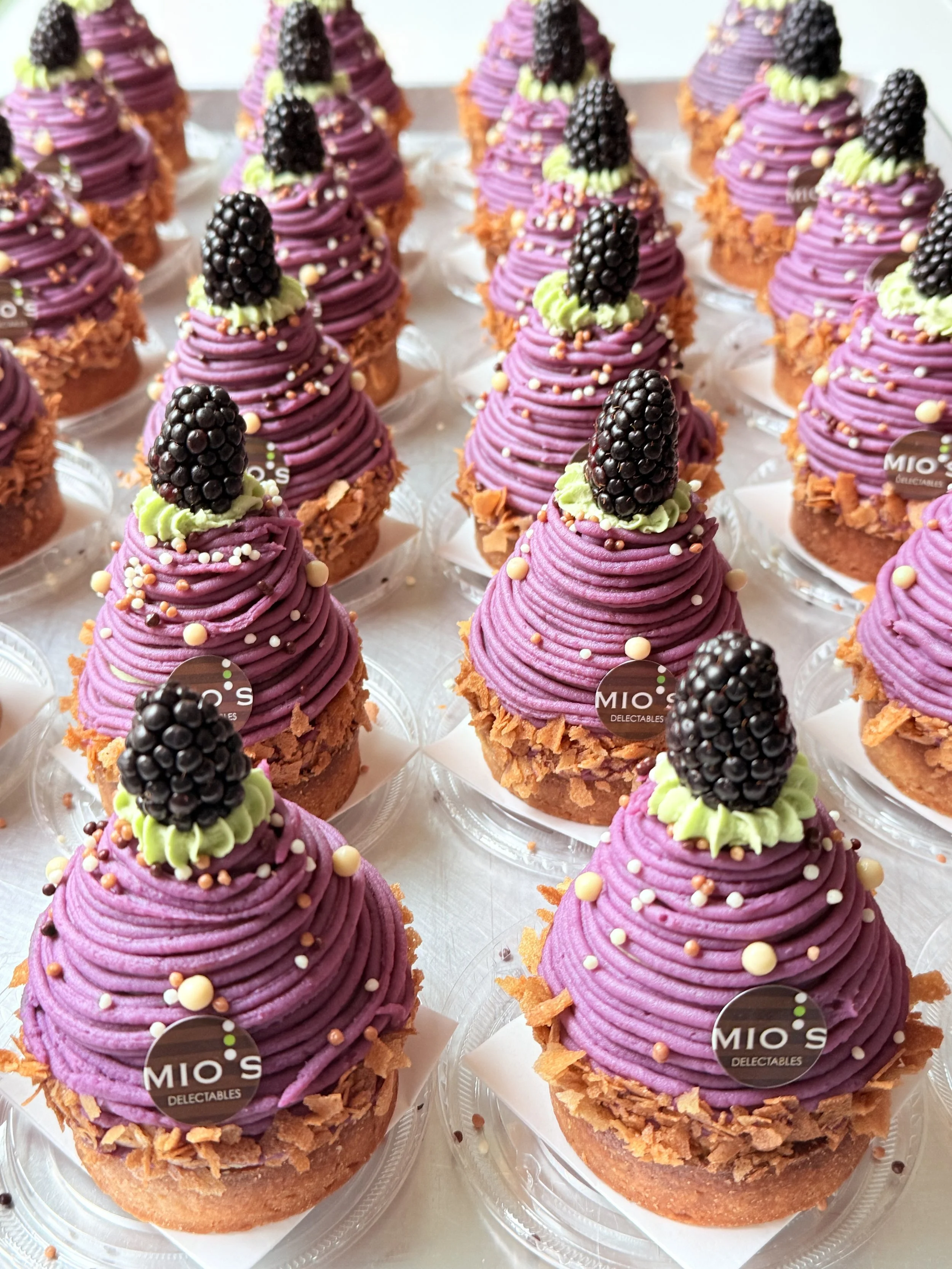 A delicate Ube Mont Blanc featuring layers of matcha cream, tart sour cherry compote, spiced pumpkin filling, and a luxurious Pinot Noir confiture.