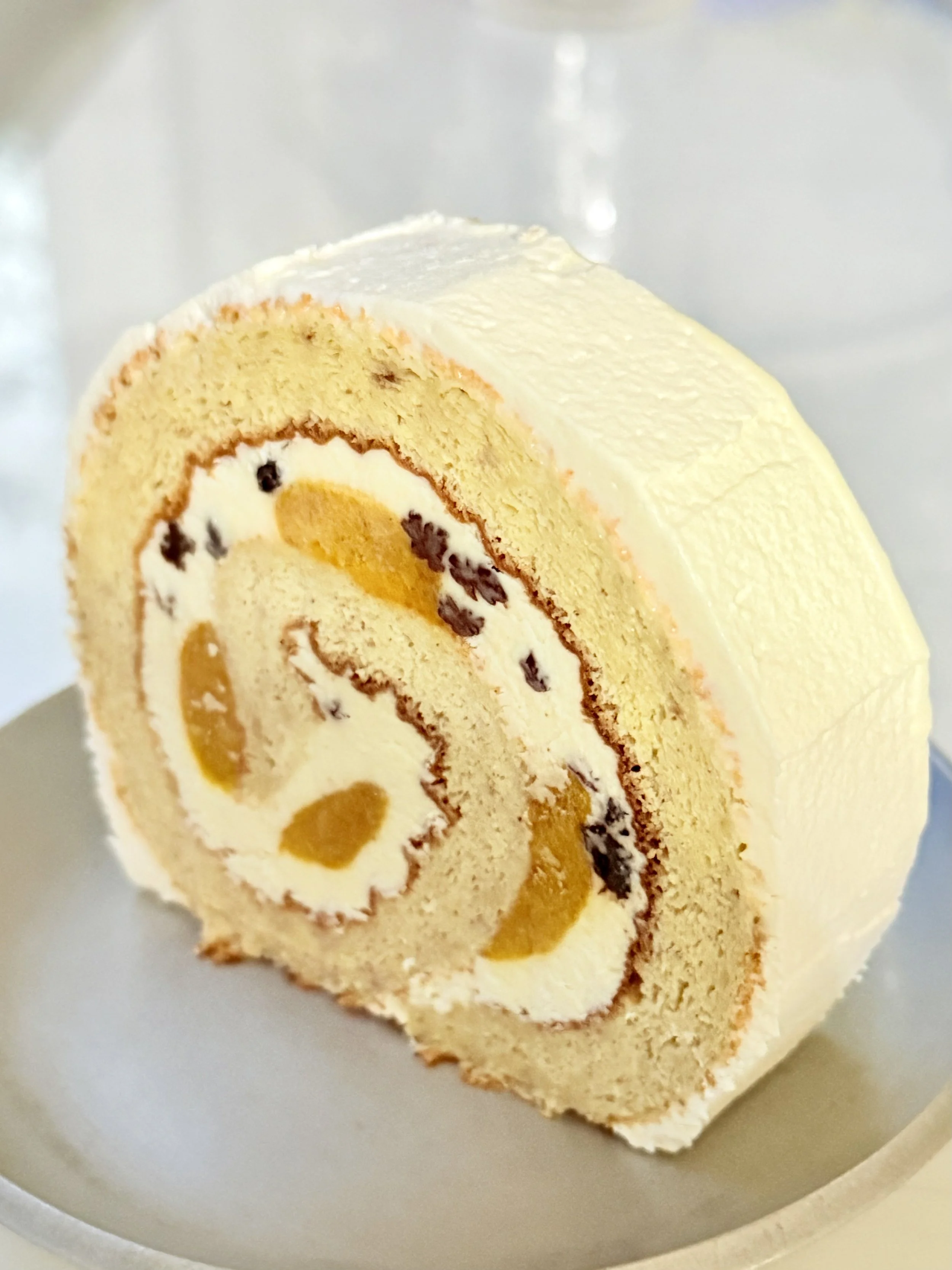 MAPLE SWISS ROLL CAKE WITH RUM-RAISIN CREAM AND JAPANESE PUMPKIN FILLING