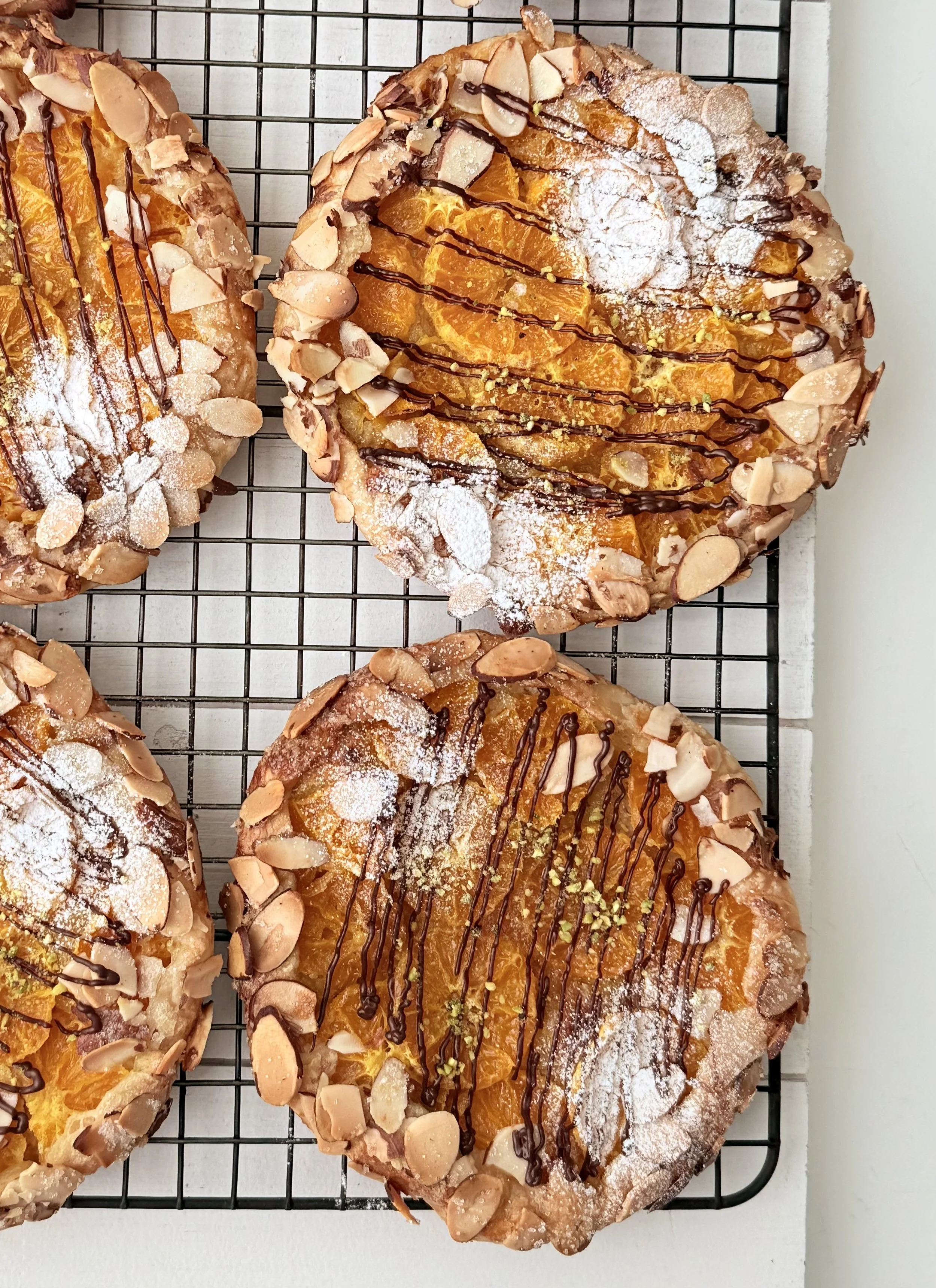 A flaky galette filled with bright mandarin orange and Marmelade de Mandarine, topped with drizzled chocolate ganache and crunchy chopped pistachios.