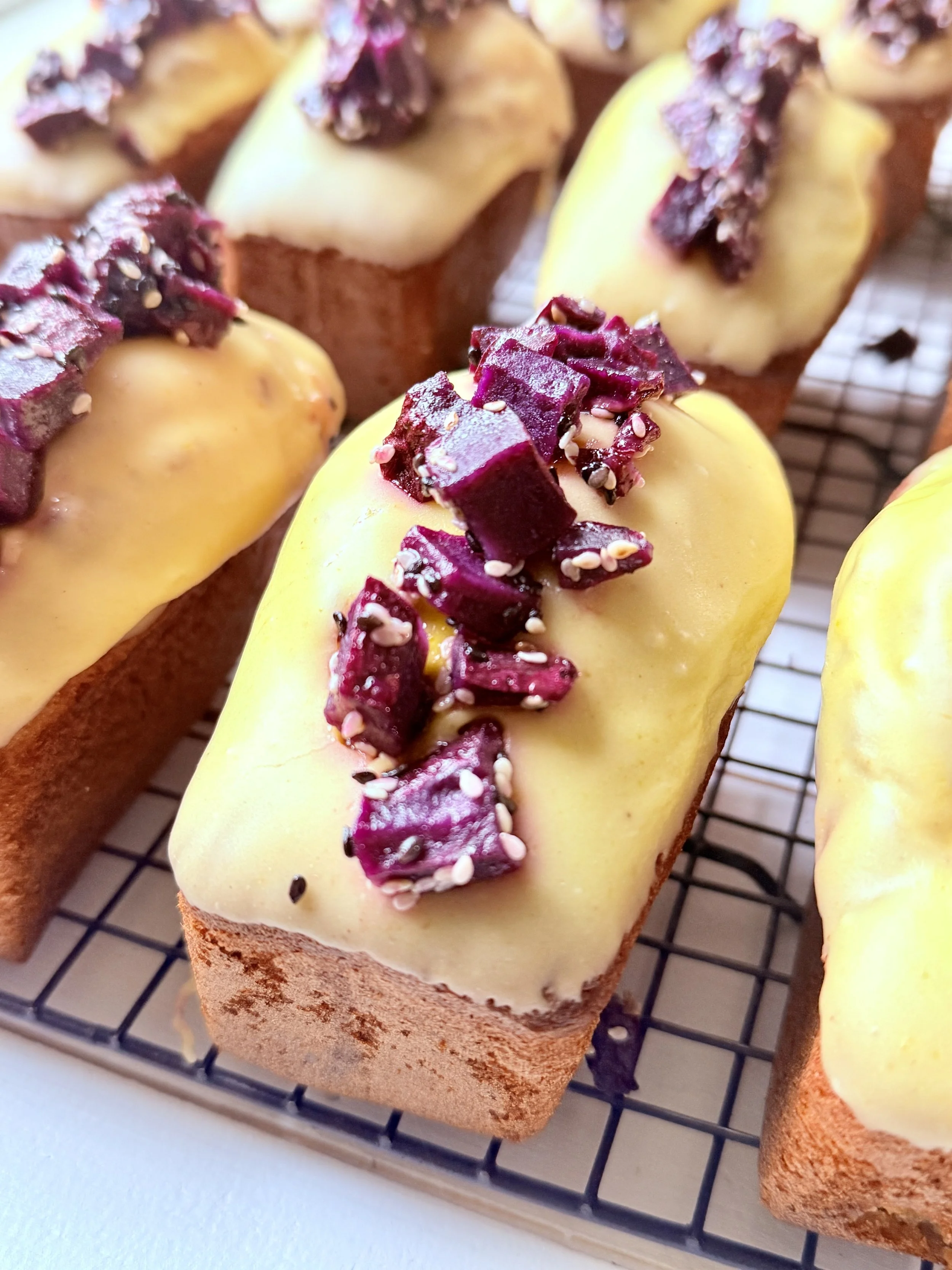 A rich almond pound cake made with Japanese pumpkin paste baked into the batter. The cake is topped with caramelized ube prepared in the style of daigaku-imo (candied sweet potato), adding both color and texture. Finished with a smooth Japanese pumpkin icing and a hint of brandy, this cake offers a beautiful harmony of flavor and elegance.