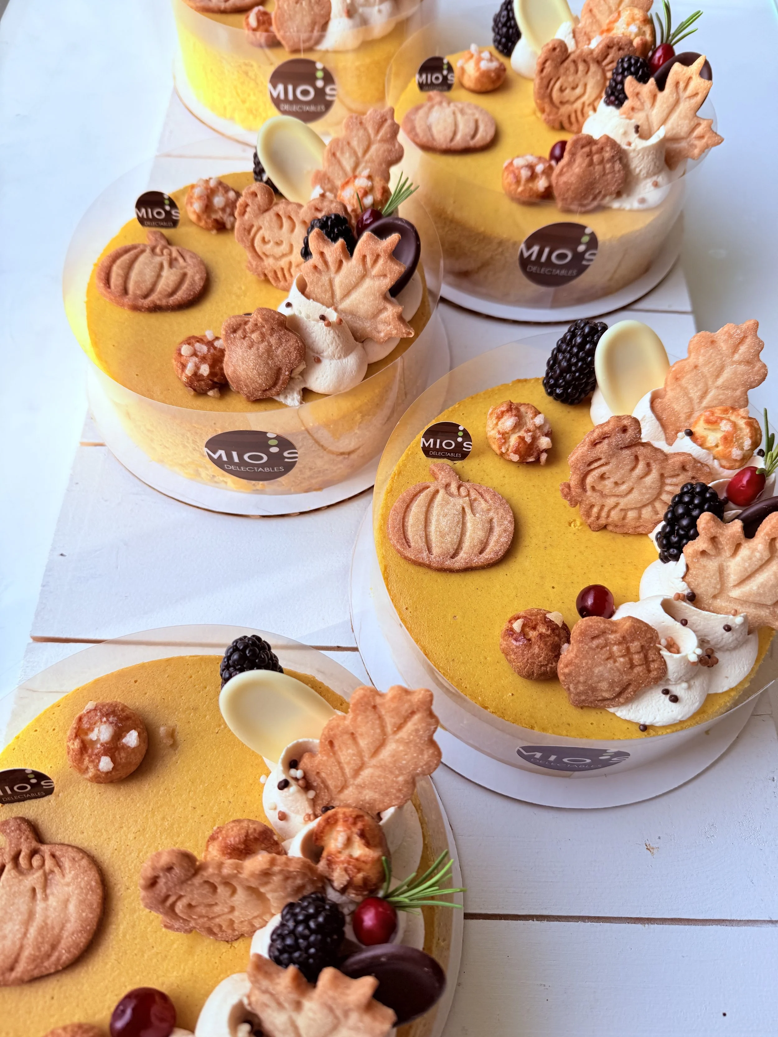 A luxurious 6” dessert layered with rich chocolate mousse, smooth Japanese organic Kabocha pumpkin cream, light maple sponge cake, creamy pistachio, naturally sweet Pinot Noir grape confiture, and chunks of salted chocolate. Handcrafted with premium ingredients for a sophisticated treat.