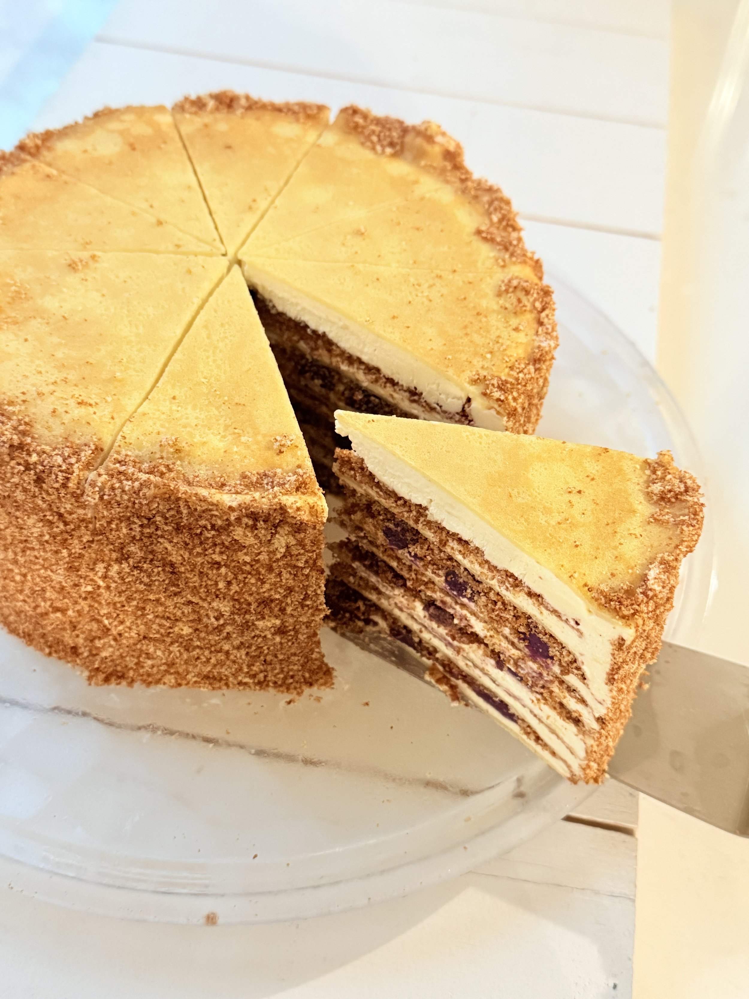 A delicate mille crepe cake layered with rich ube paste, vanilla cake crumbs, rum syrup, and smooth vanilla diplomat cream, creating a decadent and visually stunning treat.