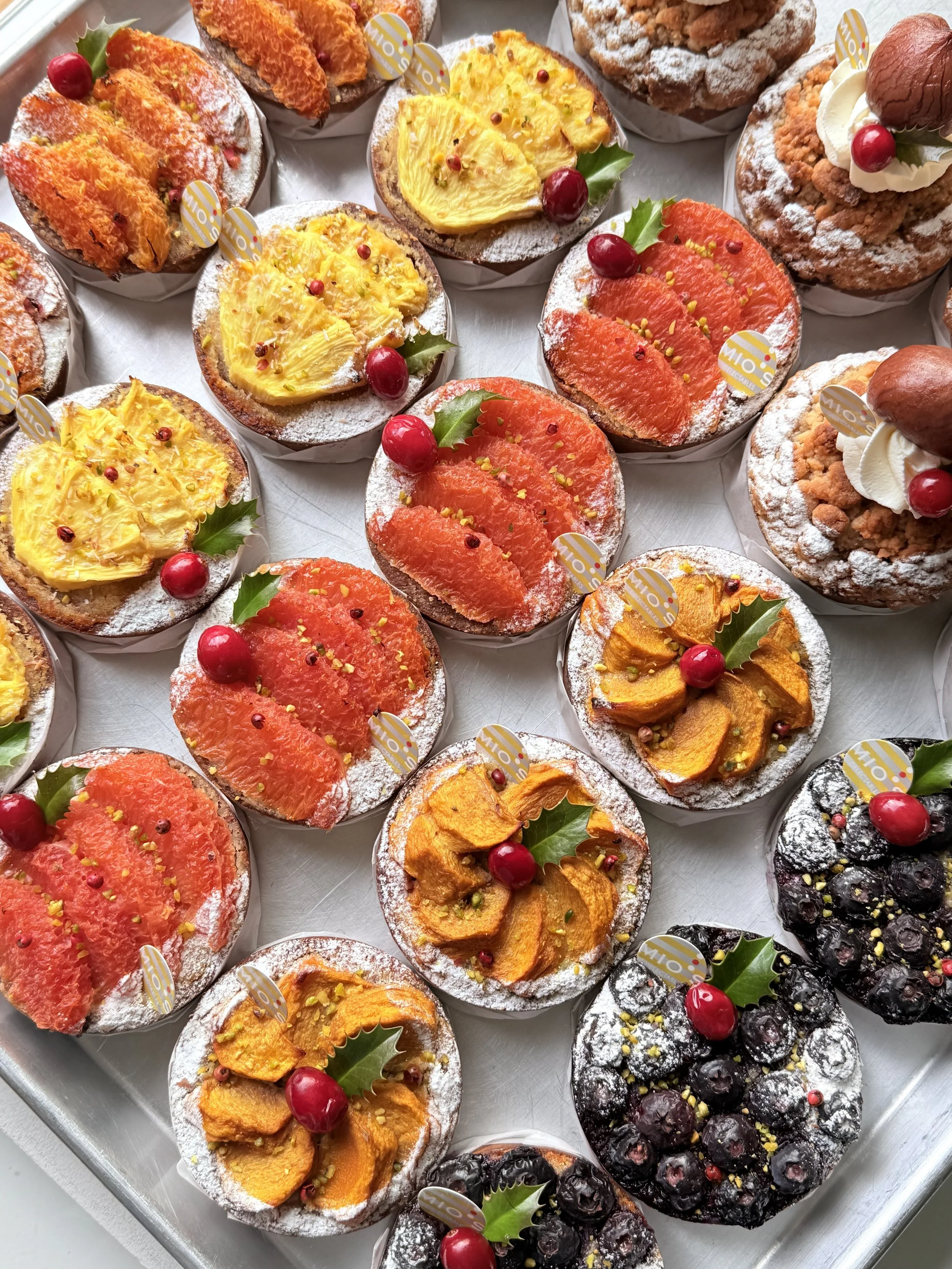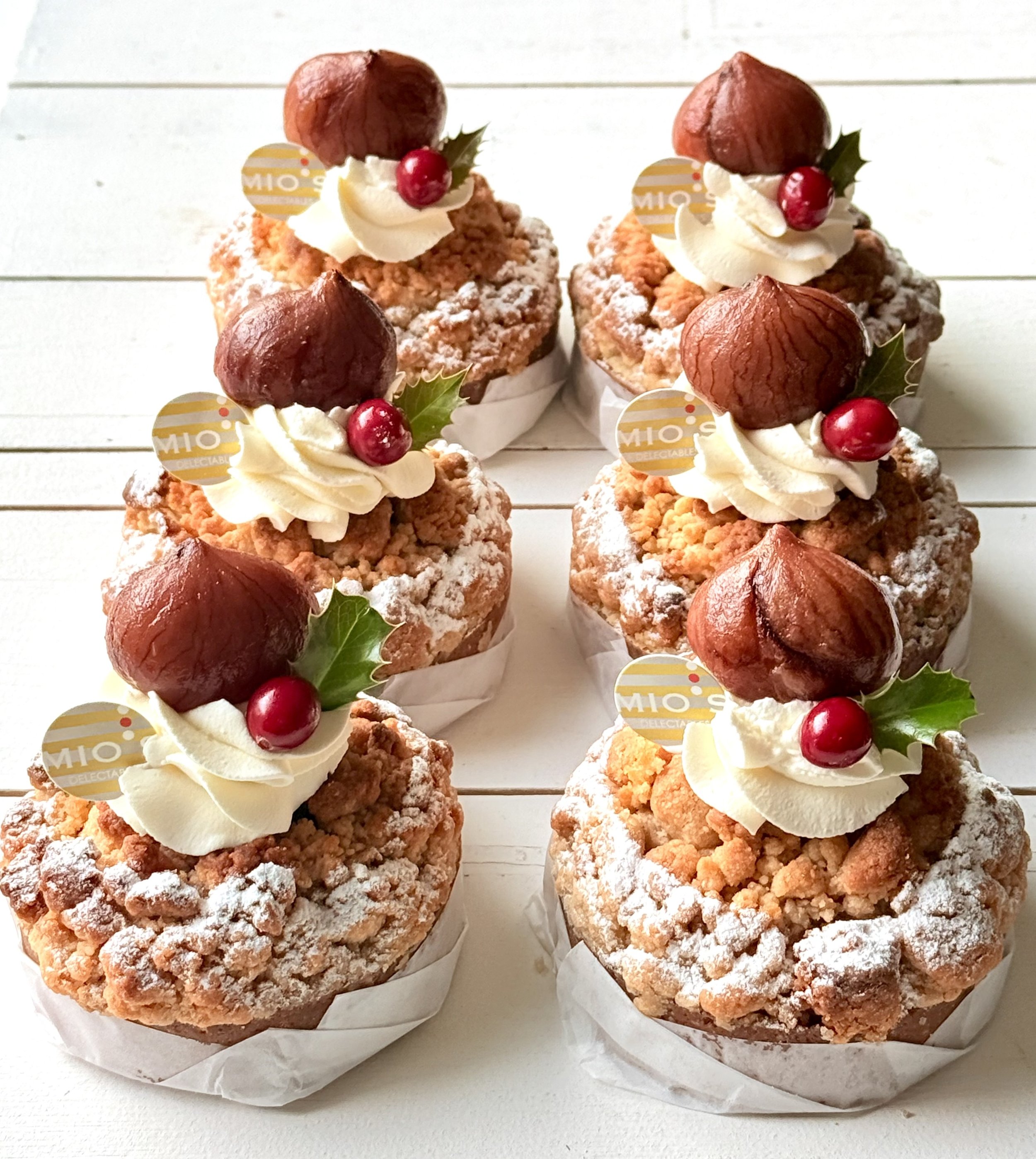 A buttery crumble tart featuring sweetened Oregon chestnuts, complemented by a rich Pinot Noir grape confiture. Decorated for the holidays, this tart combines nutty, creamy chestnuts with the deep, fruity flavor of Pinot Noir grapes for a festive and indulgent dessert.