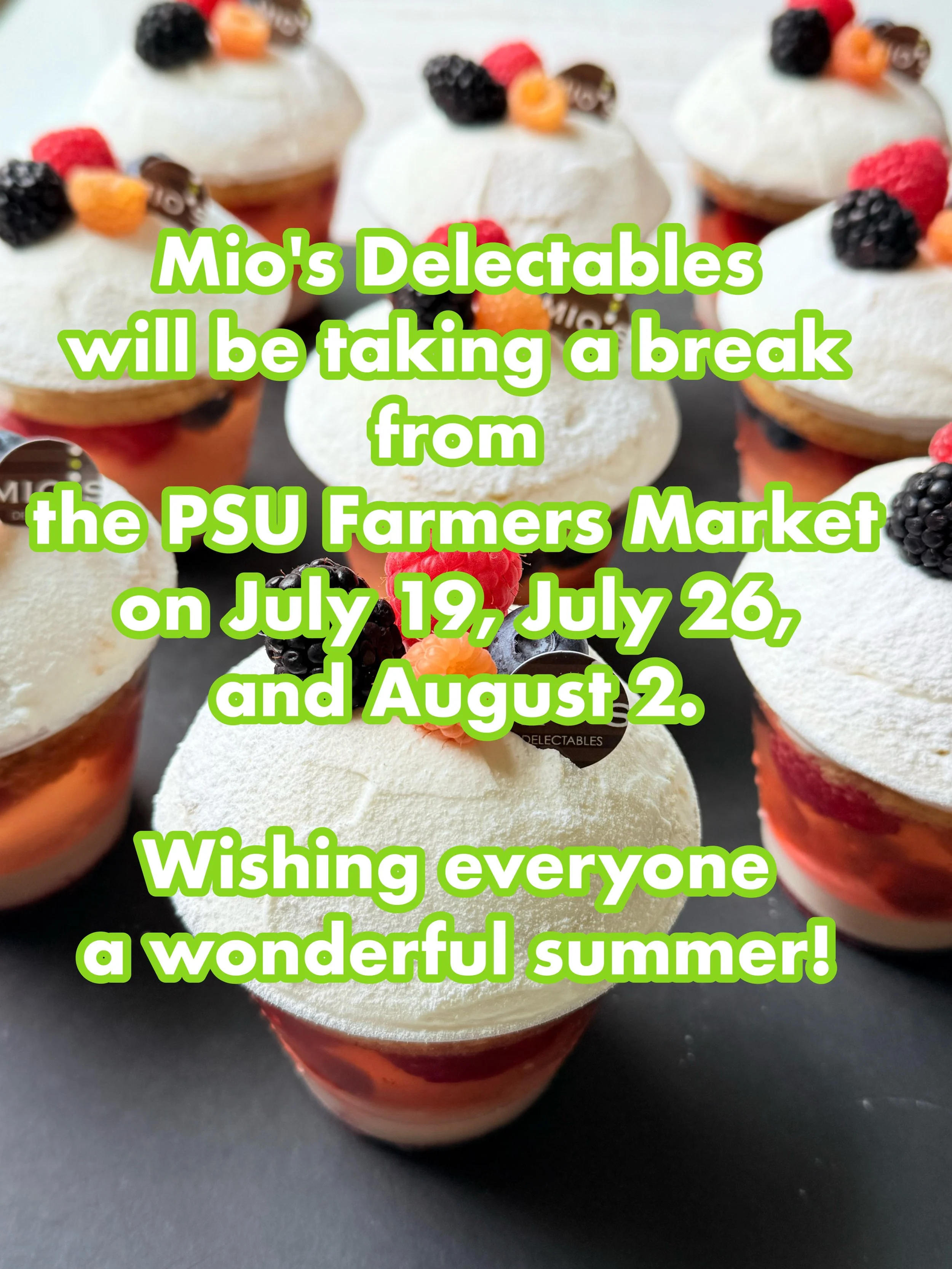 Mio's Delectables will be taking a break from the PSU Farmers Market on July 19, July 26, and August 2.