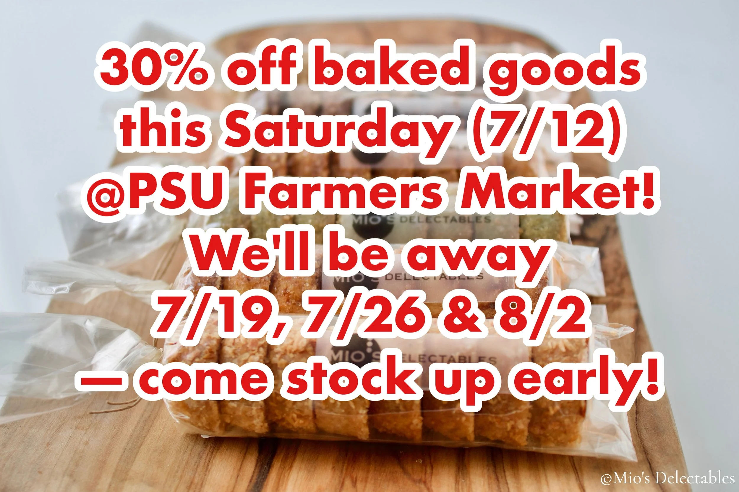 30% off baked goods this Saturday (7/12) @PSU Farmers Market! We'll be away 7/19, 7/26 & 8/2 — come stock up early!