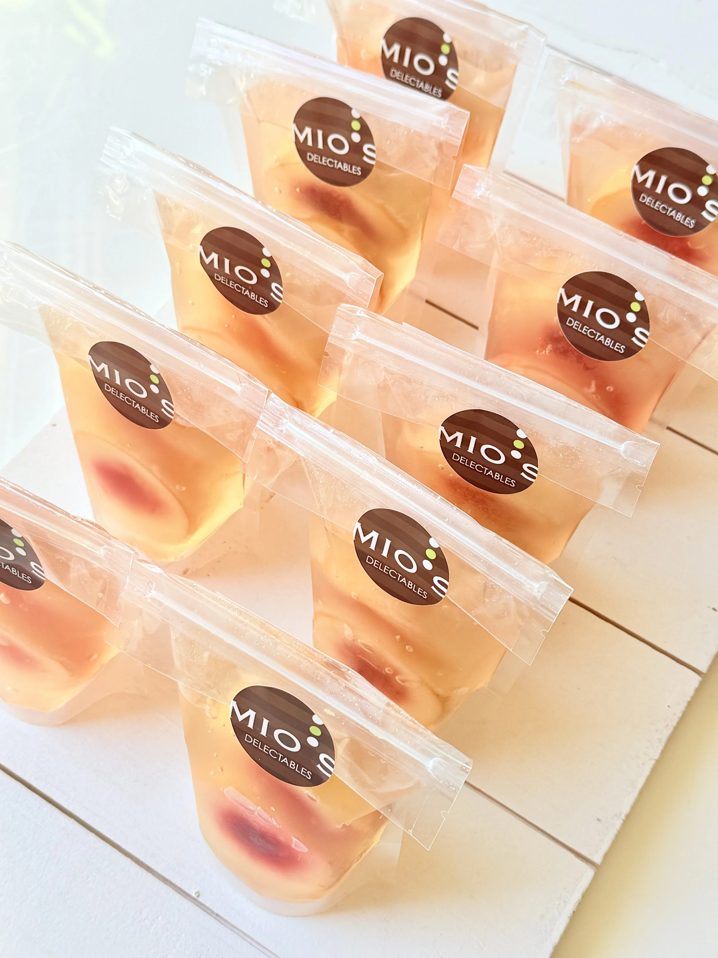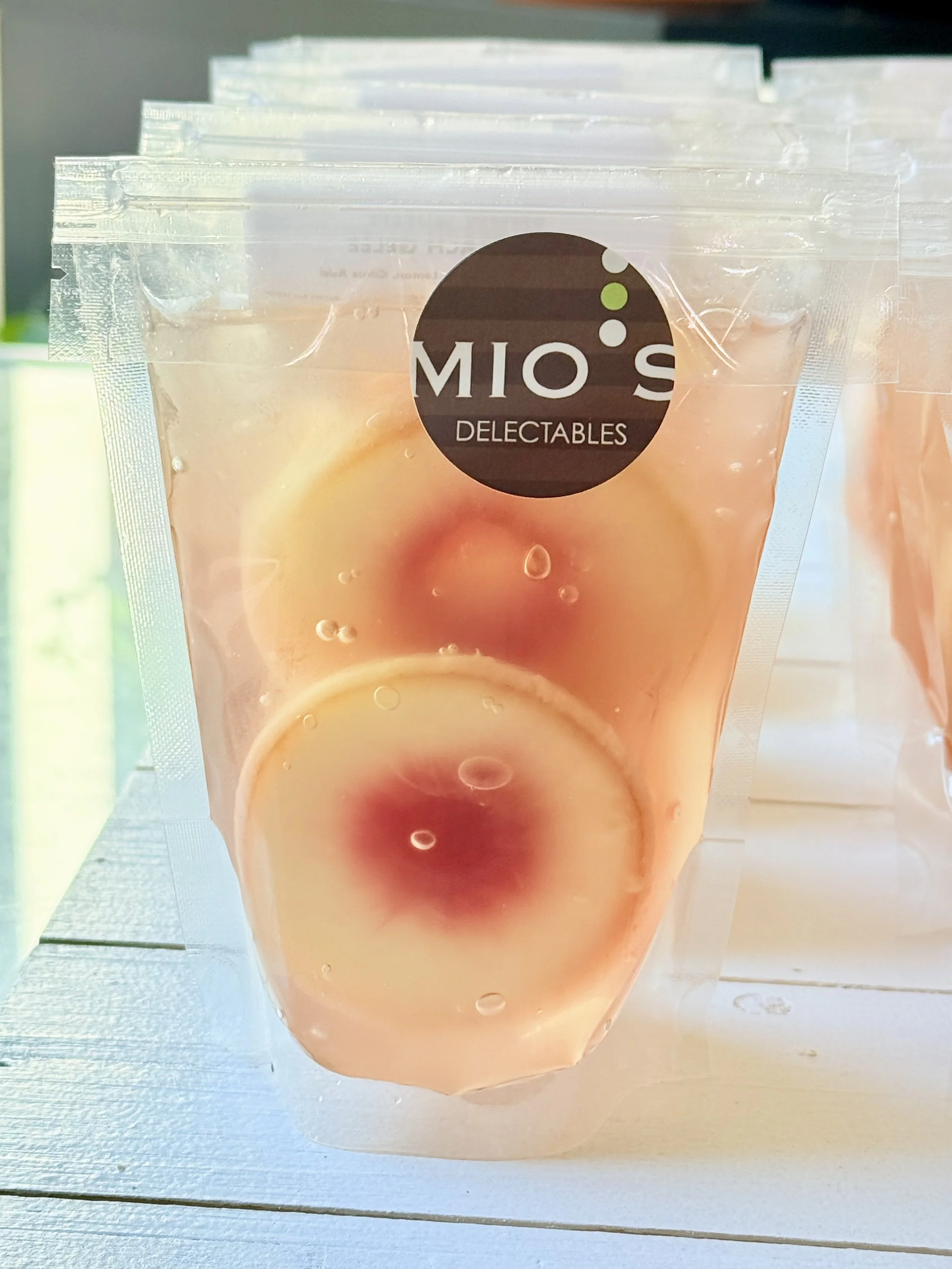 Juicy Snow Queen White Peach from Baird Family Orchards, encased in a citrus-bright lemon agar gelée, perfectly chilled for a refreshing finish.