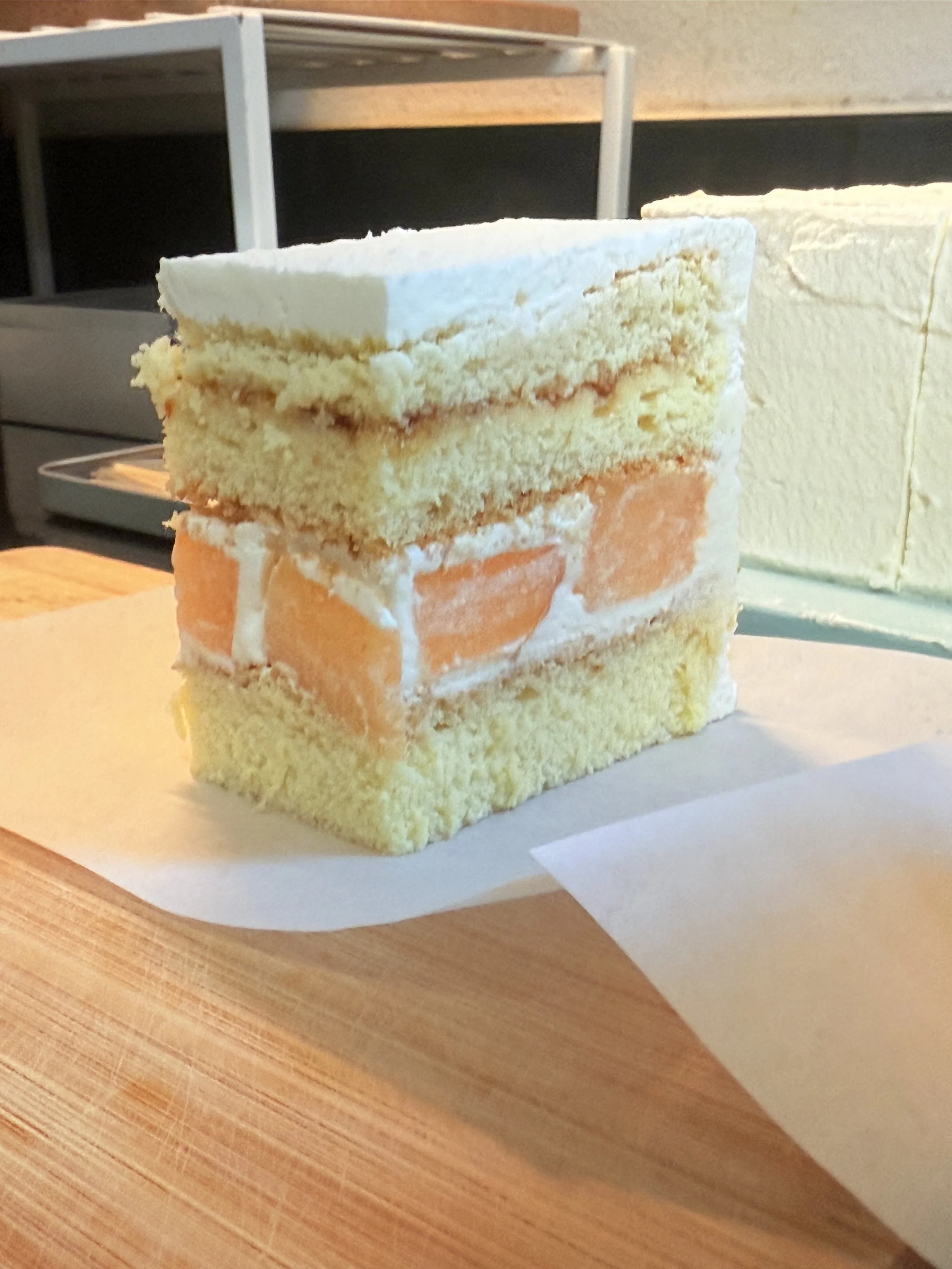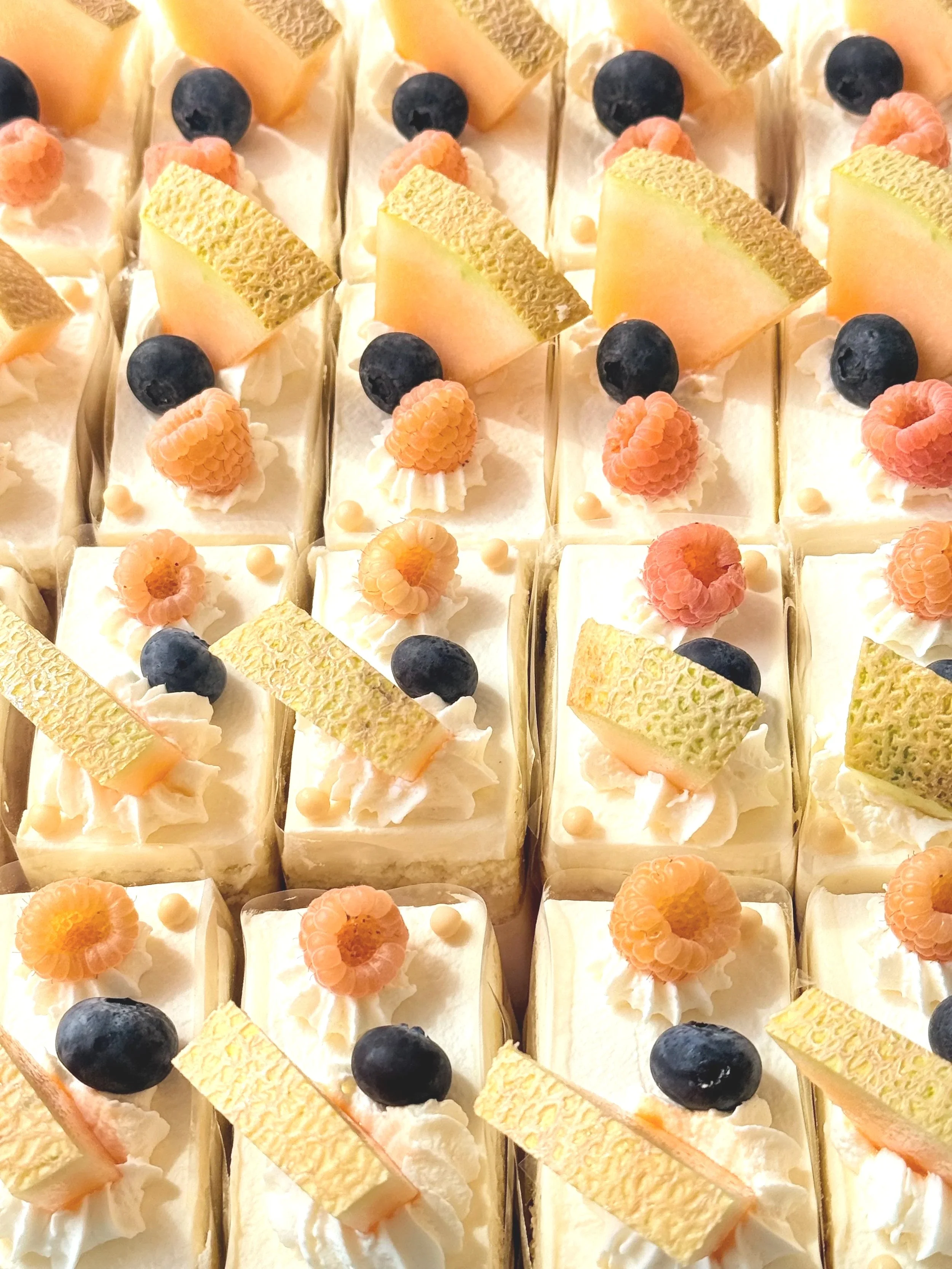 A light and airy Japanese-style shortcake layered with fluffy vanilla sponge and fresh melon, paired with a delicate white plum confiture. A refreshing harmony of pure sweetness and gentle fruitiness.