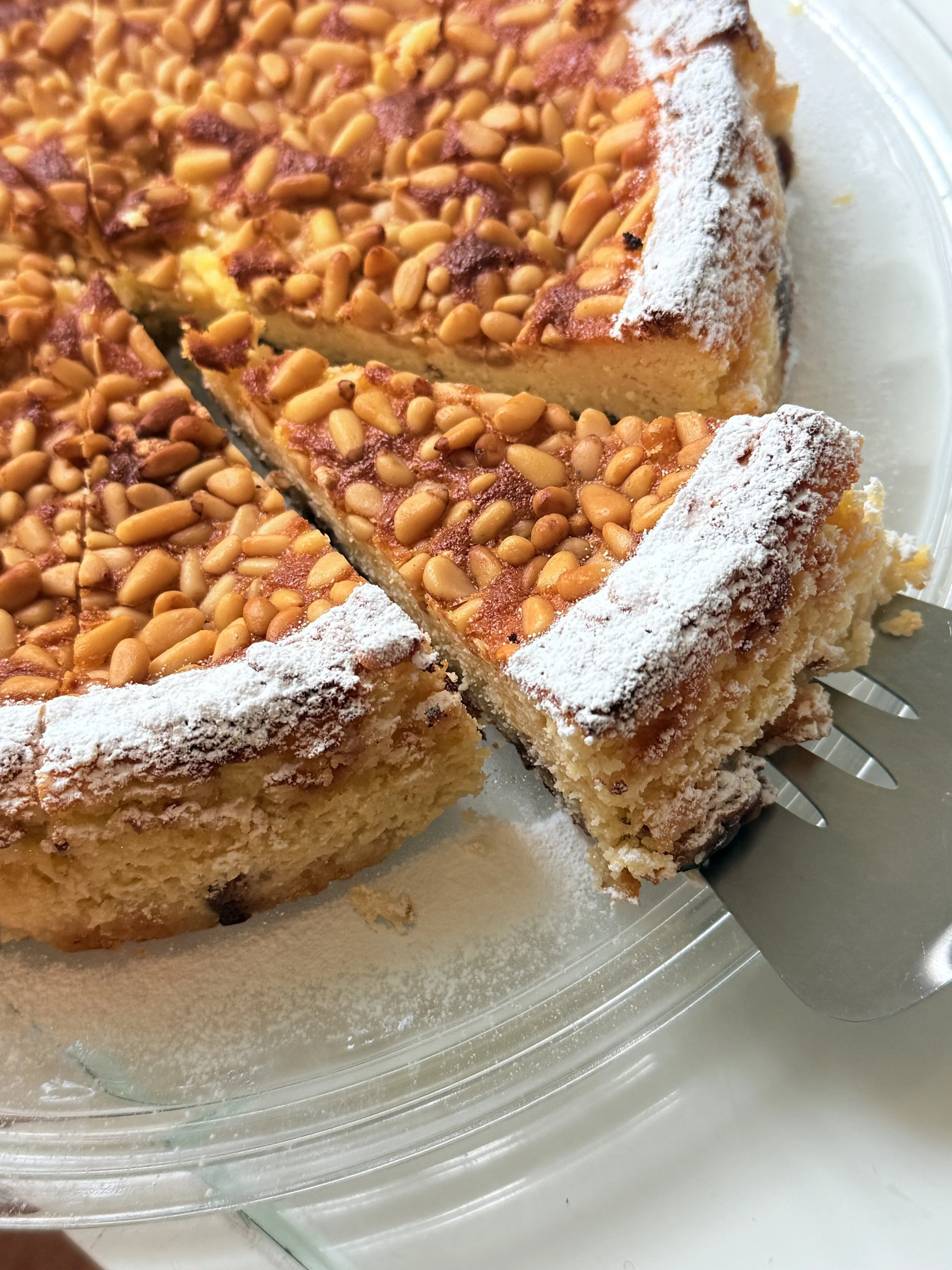 A classic Italian ricotta torta, lightly sweet and adorned with crunchy pine nuts. Soft, creamy, and perfect for a refined dessert moment or afternoon treat.