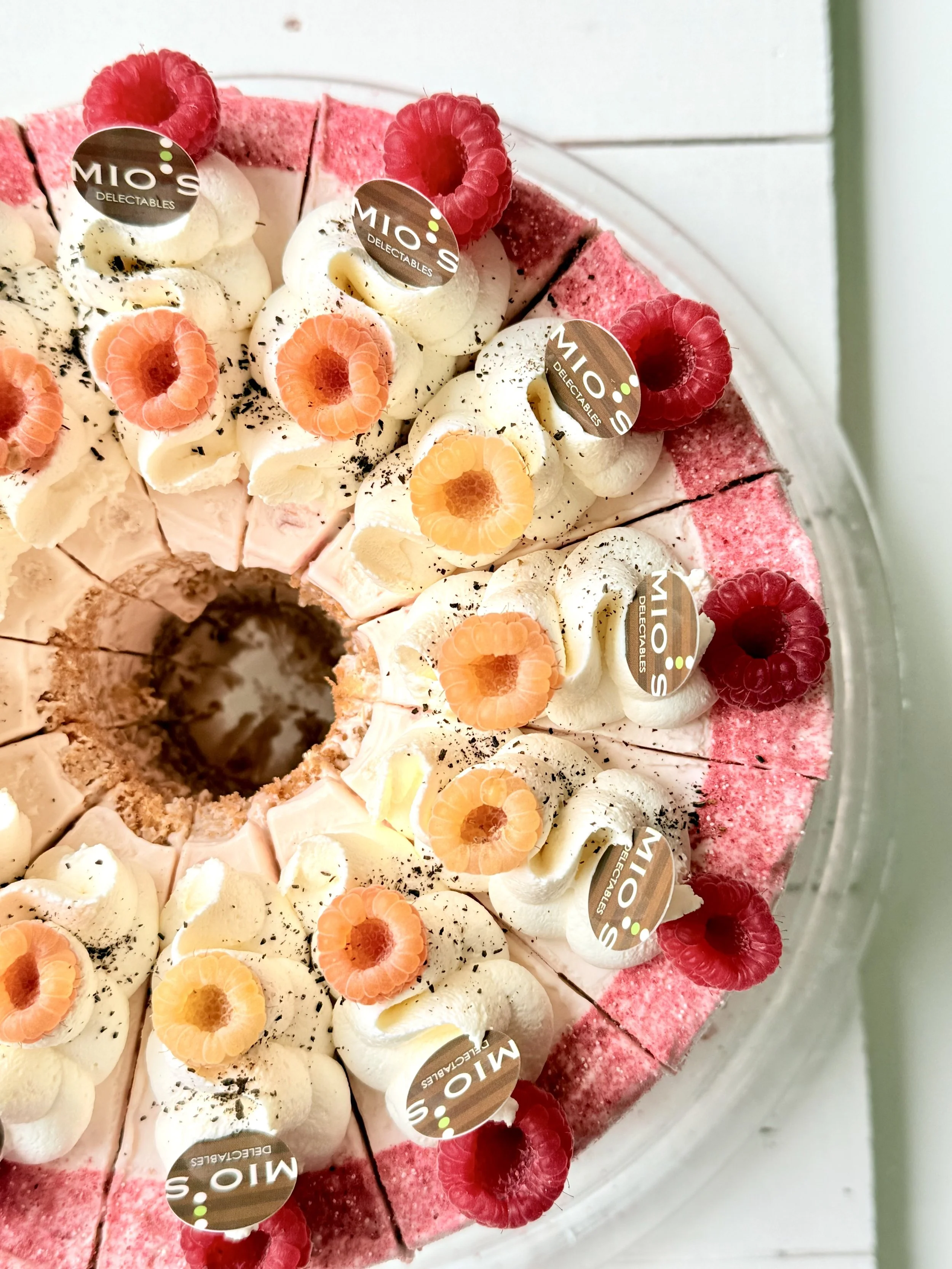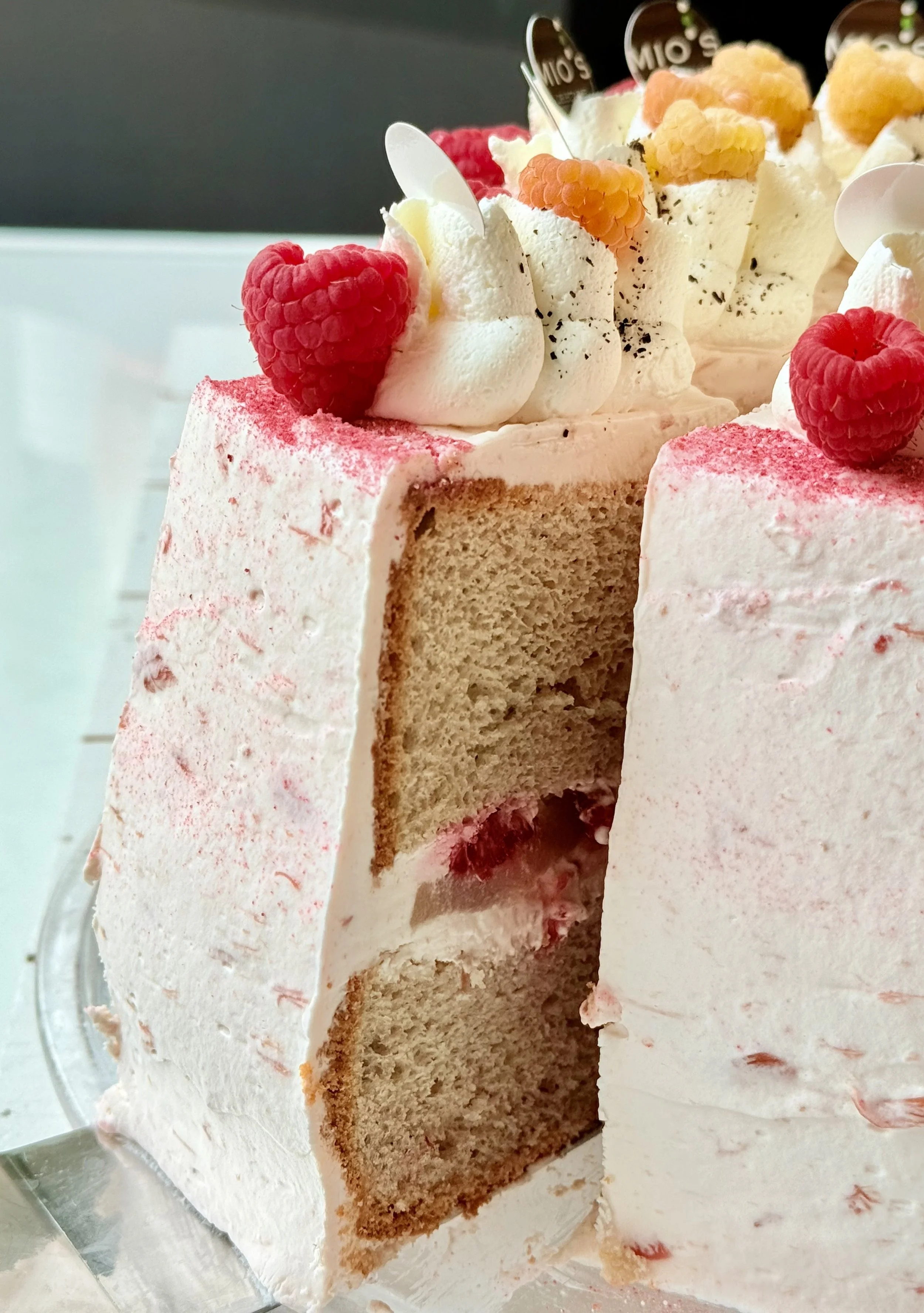 A light and fluffy royal milk tea chiffon cake, layered with pear compote and fresh raspberries, finished with a delicate rhubarb-infused whipped cream. Refreshing, elegant, and perfect for late summer.