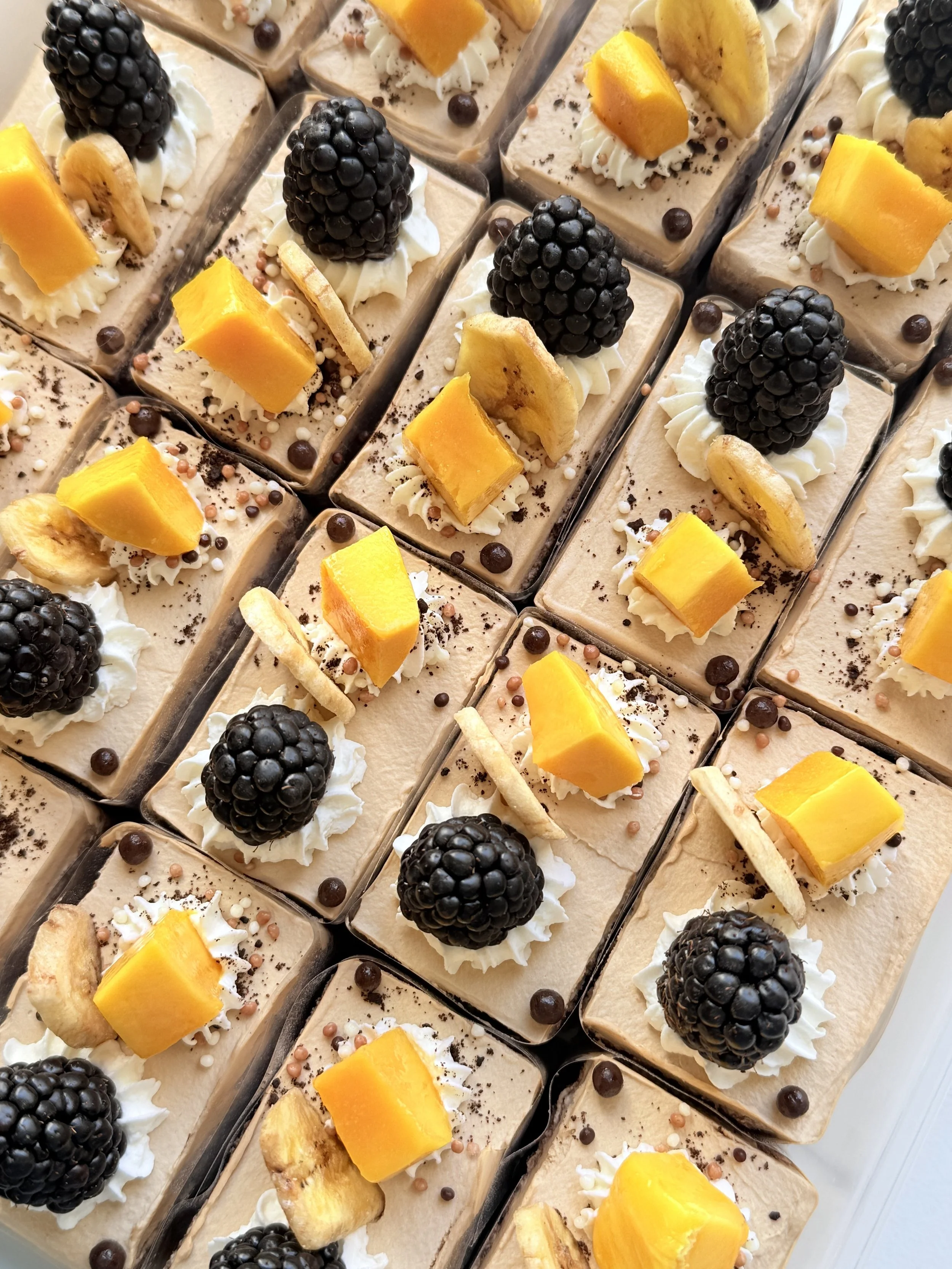 A decadent shortcake layered with fresh mango and banana, rich hazelnut chocolate, and finished with silky coffee cream. Lush, flavorful, and perfect for an indulgent late-summer treat.