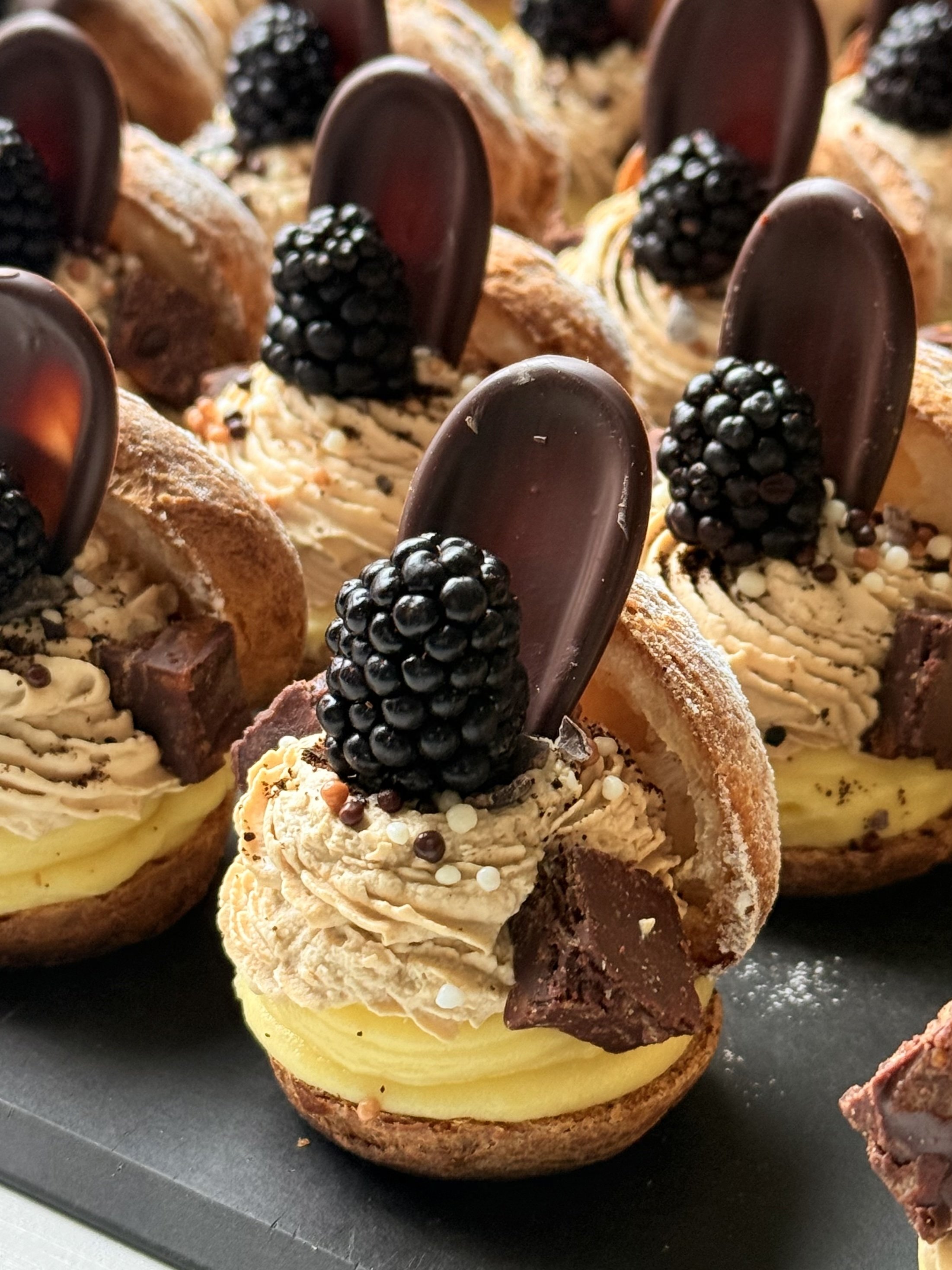 Light and airy choux pastry filled with smooth coffee cream, paired with a rich caramel-chocolate bite, Cristian au Caramel.