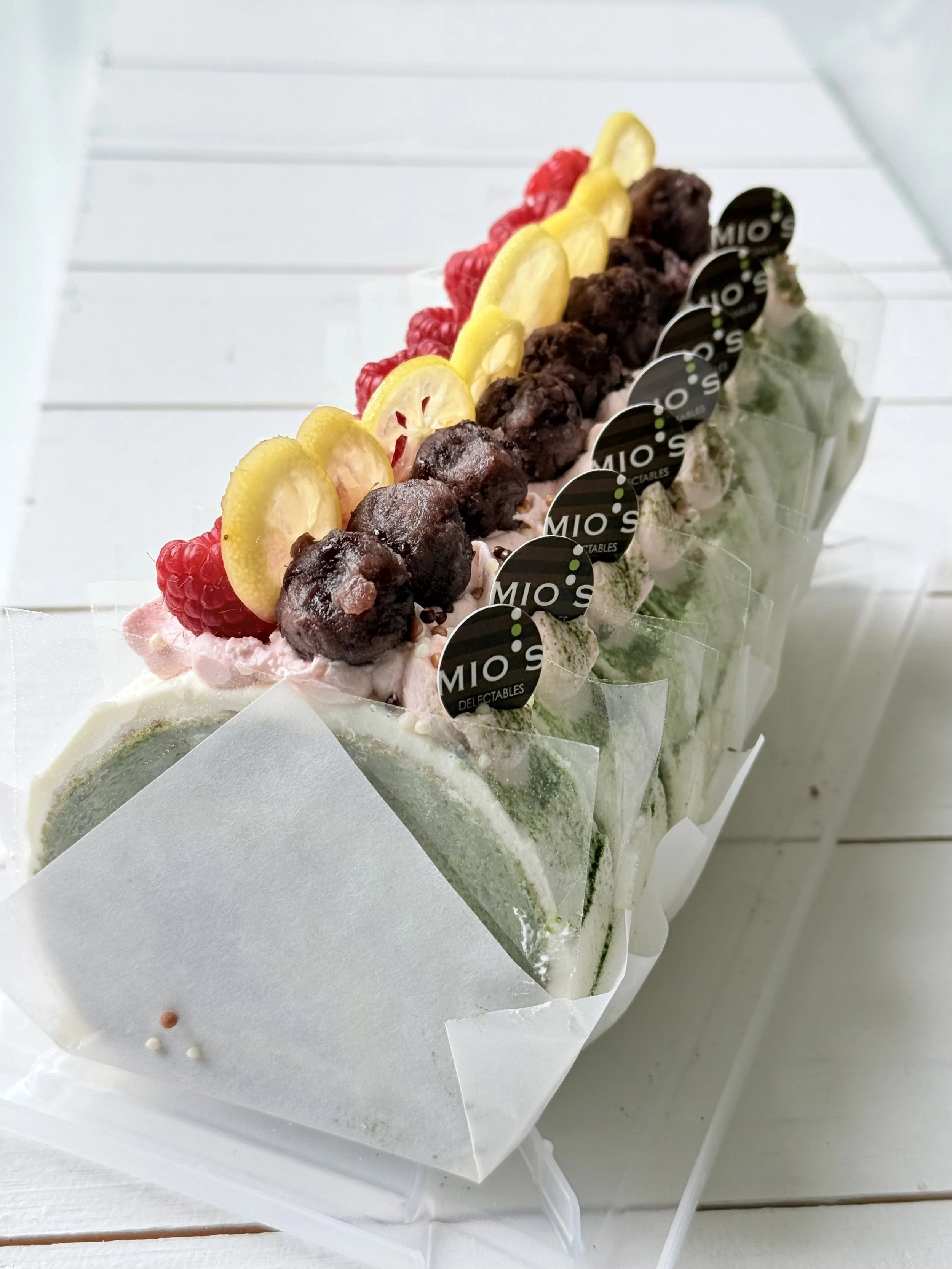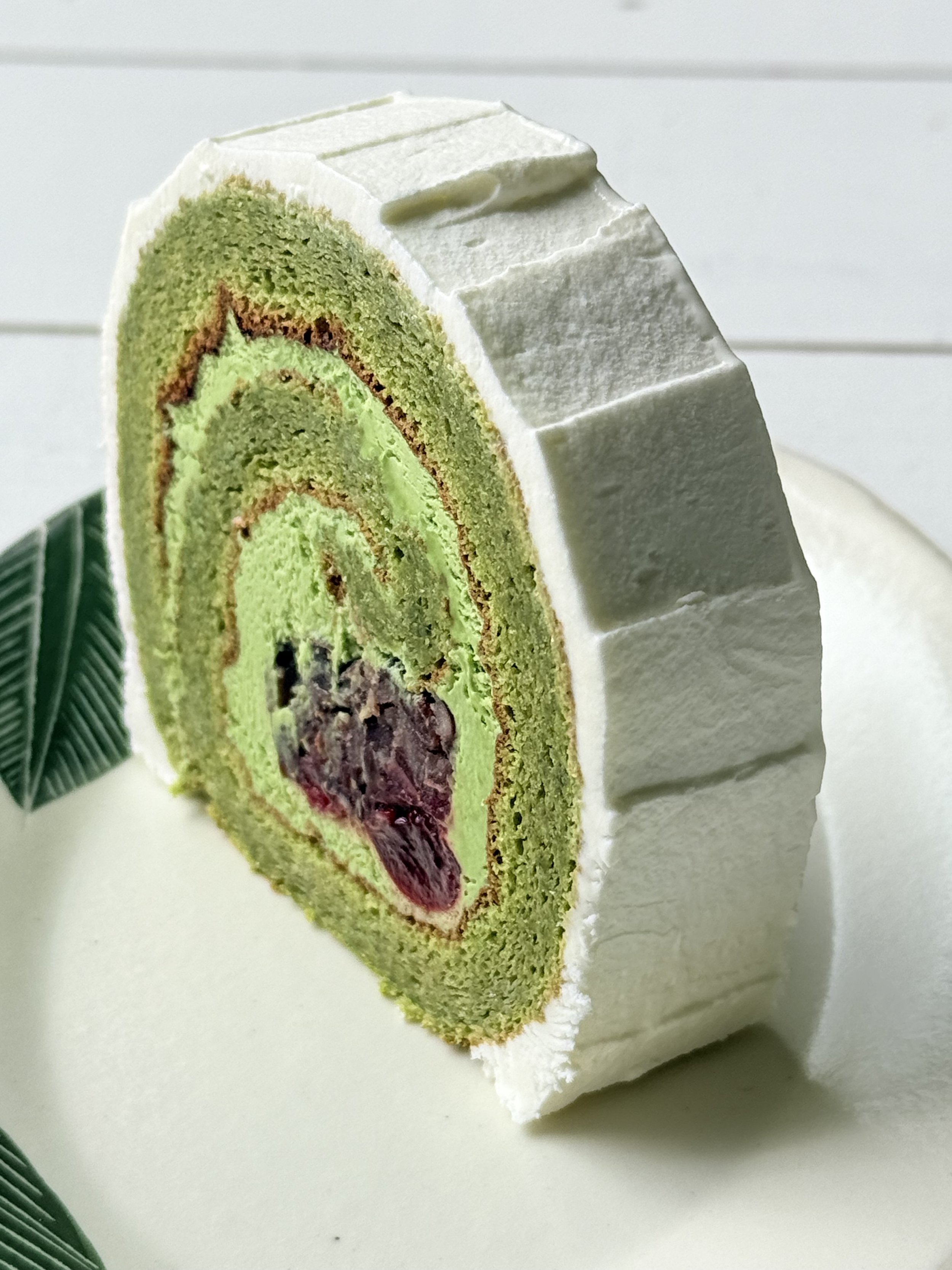 A soft and fluffy matcha sponge roll filled with creamy matcha cream, sweetened azuki beans, vibrant cherry compote, and a touch of zesty yuzu confiture.