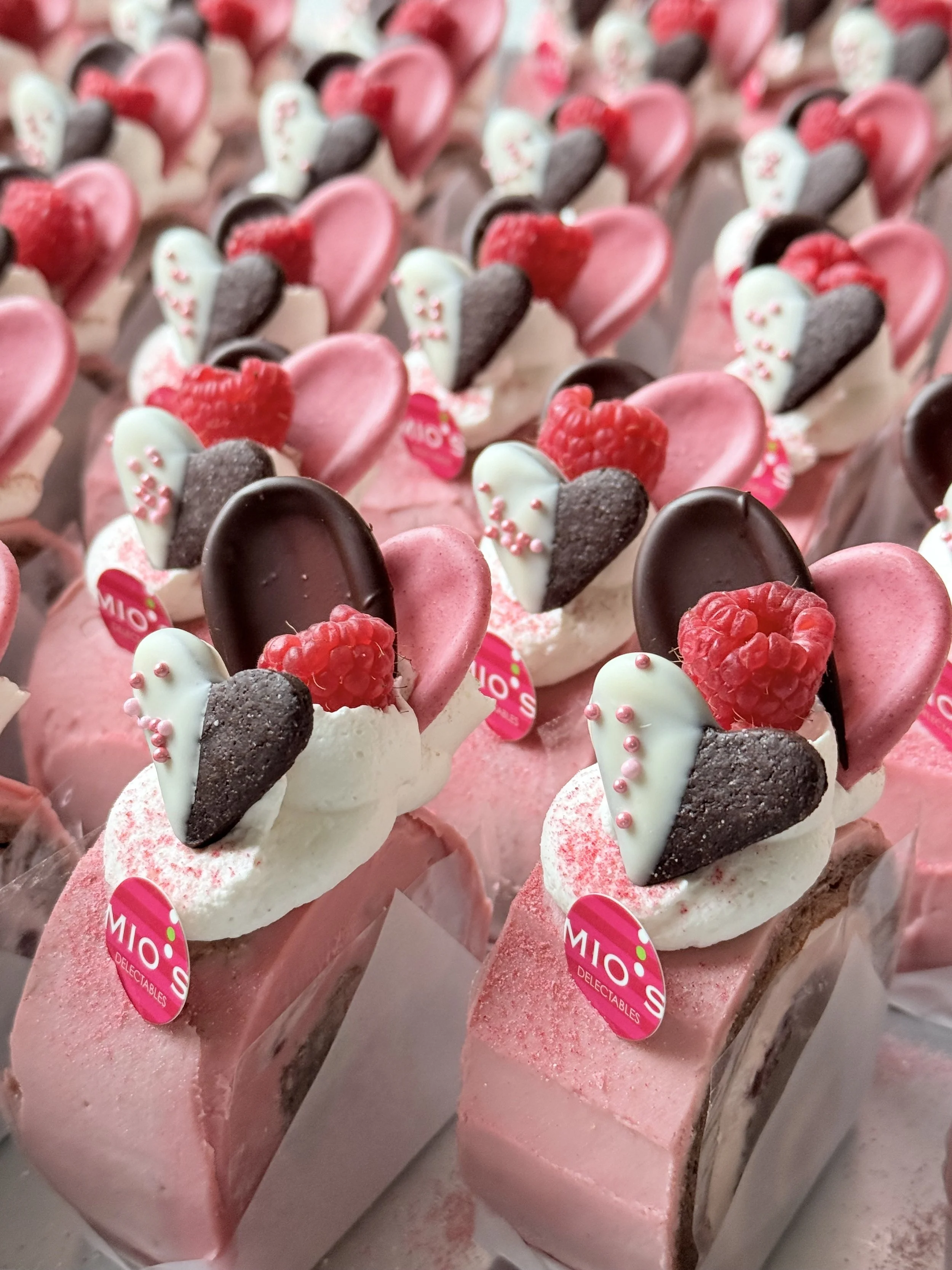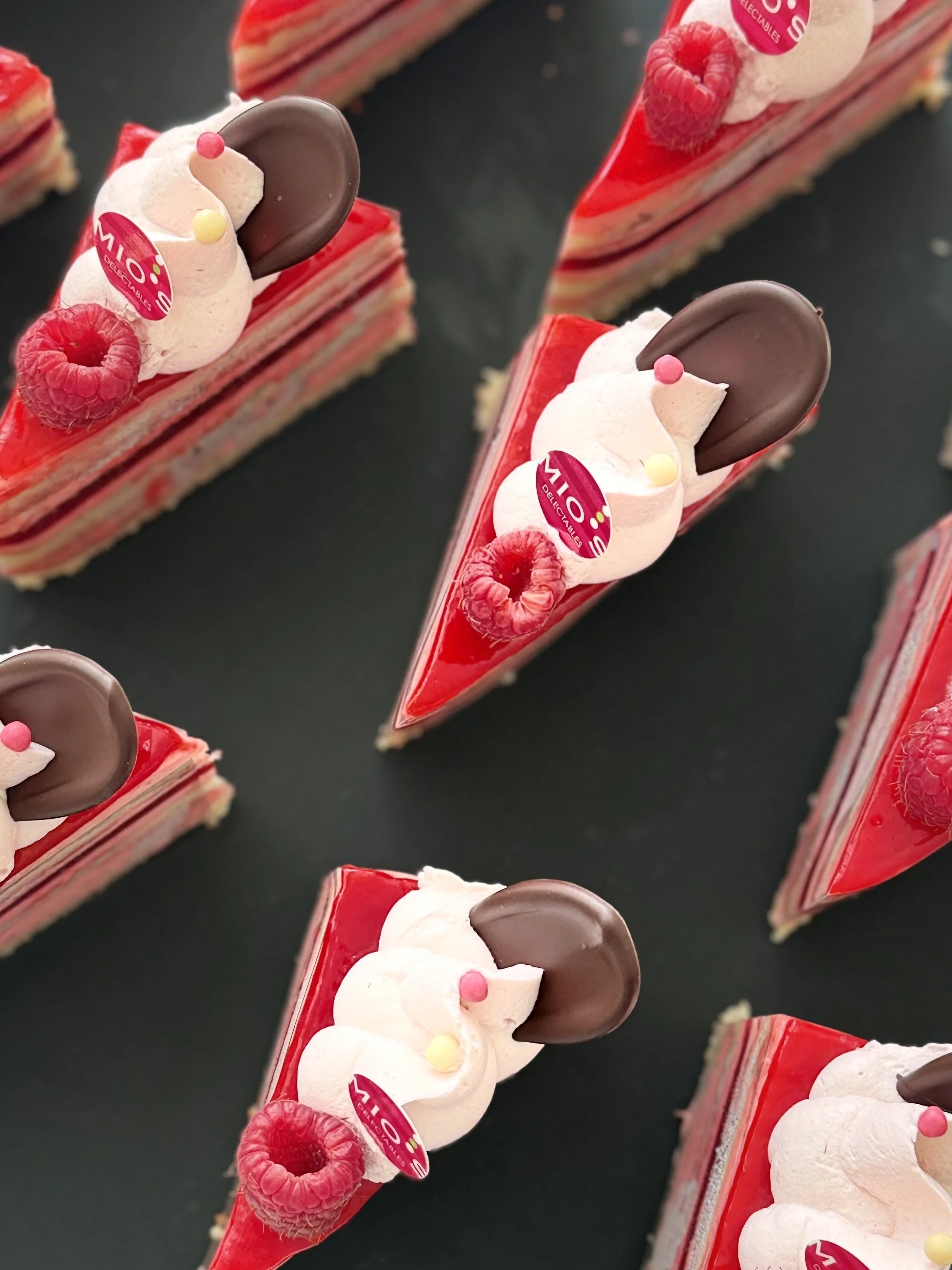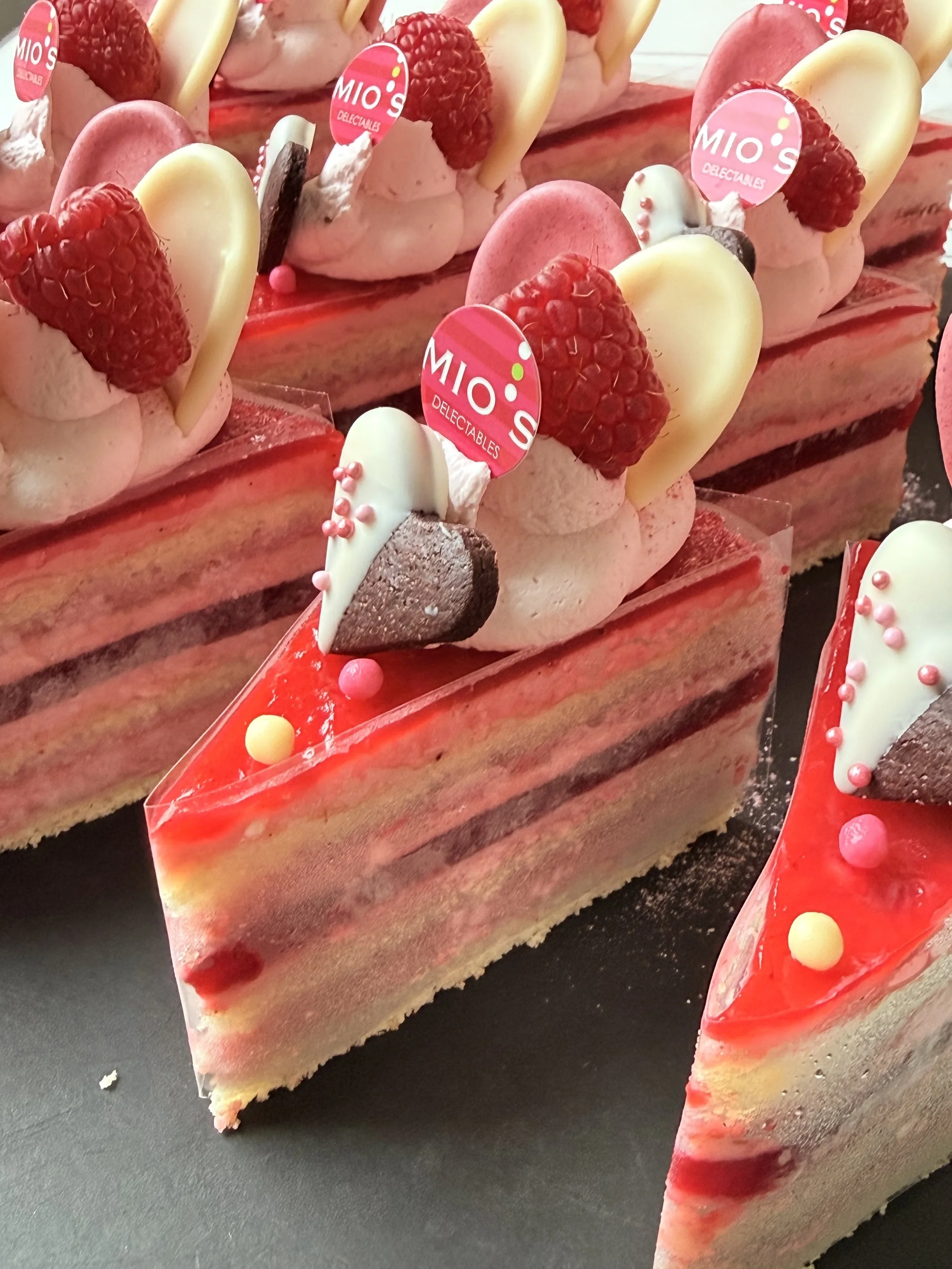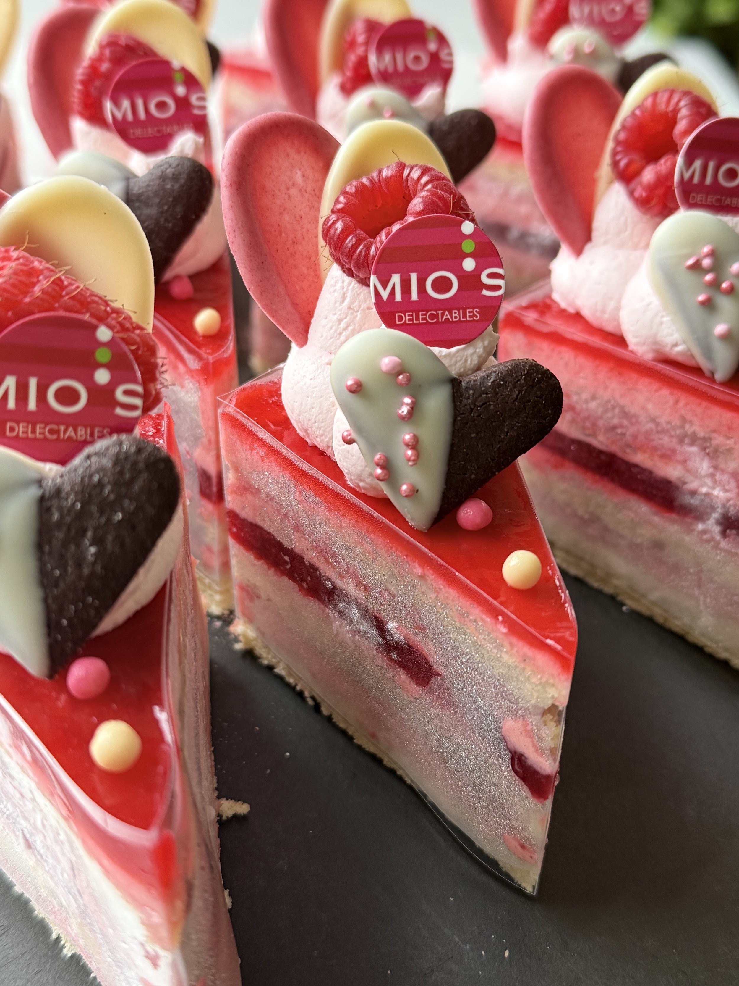 Layers of raspberry mousse, delicate sponge, and bright raspberry gelée, finished with a silky glaze — and decorated especially for Valentine’s Day