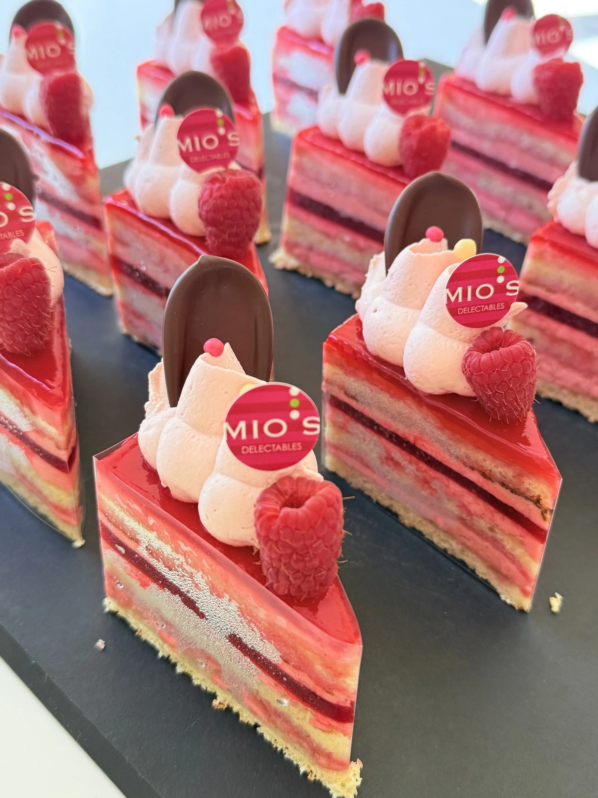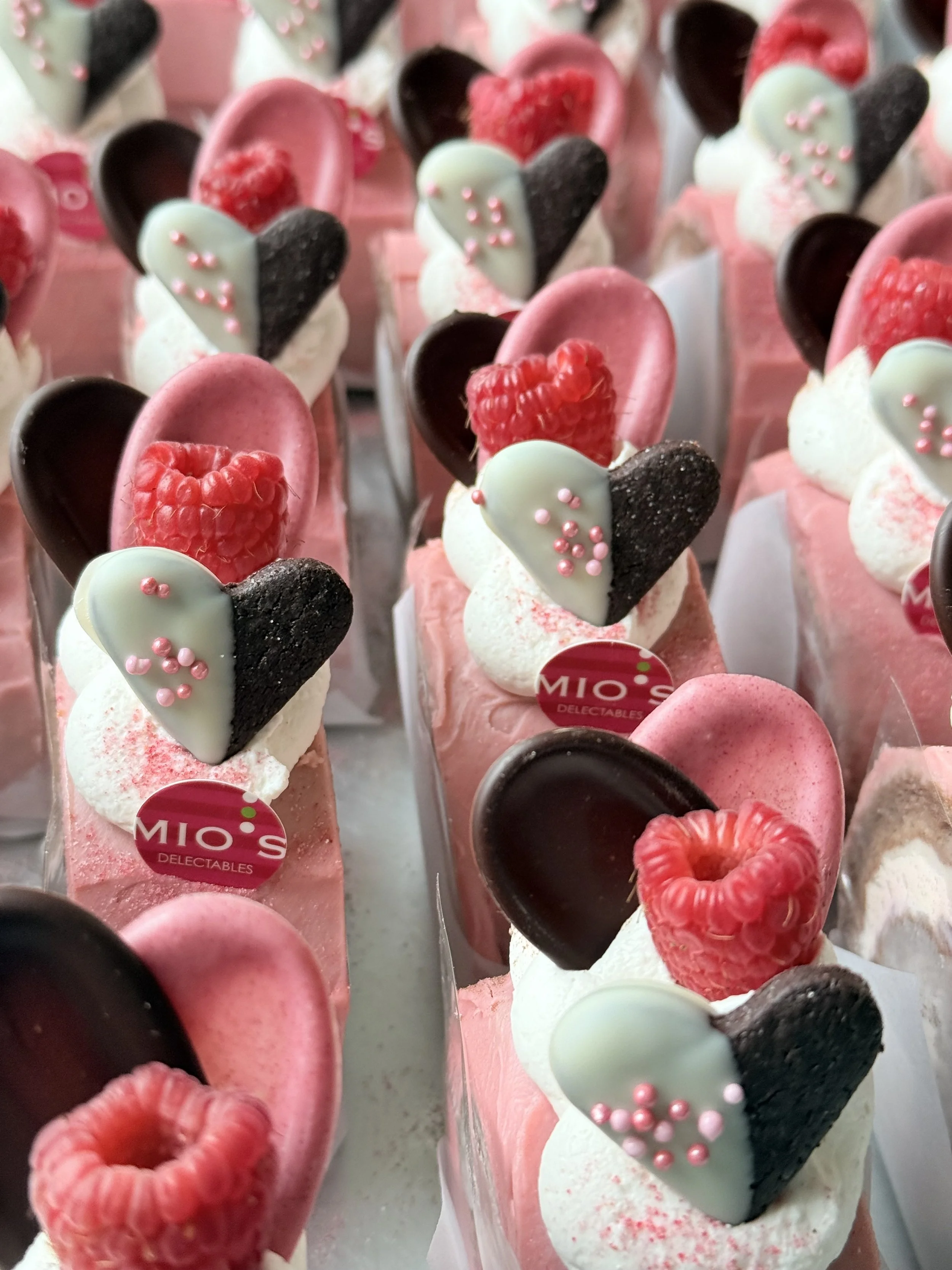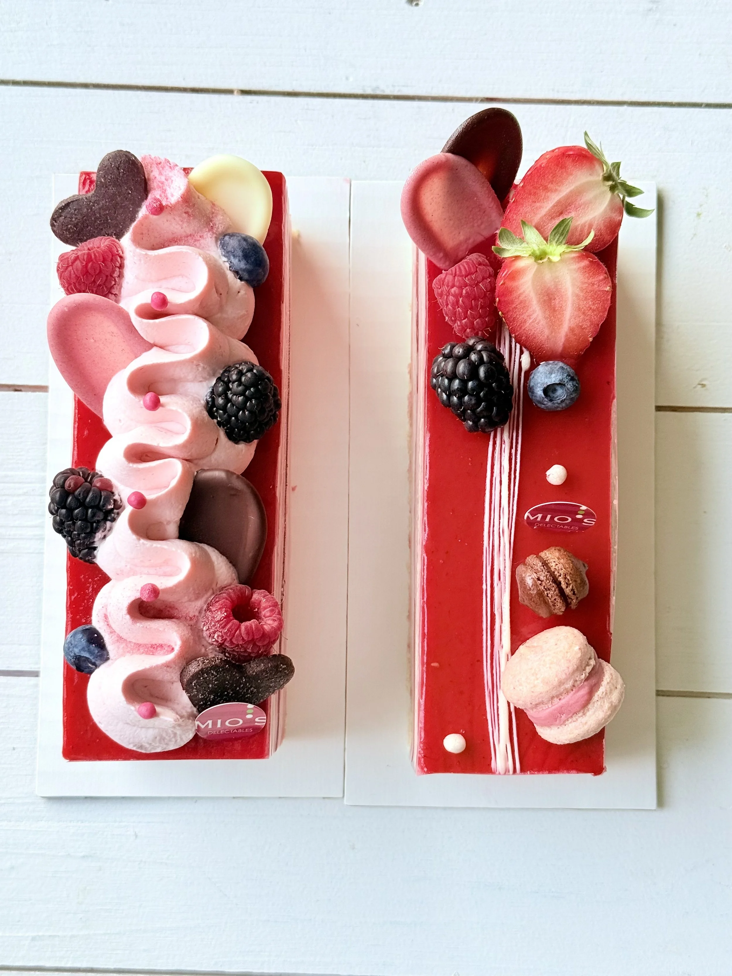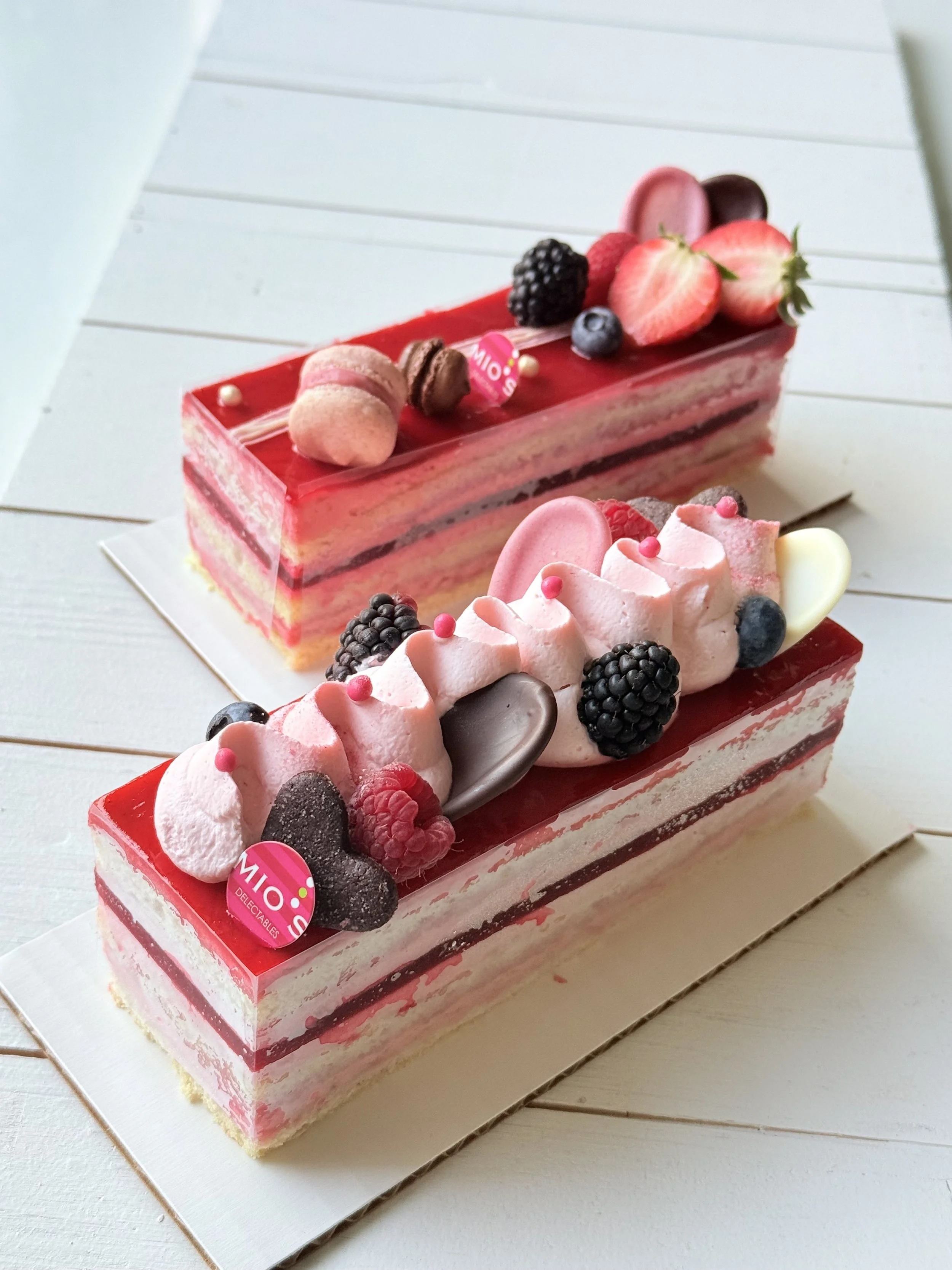 Layers of raspberry mousse, delicate sponge, and bright raspberry gelée, finished with a silky glaze — and decorated especially for Valentine’s Day