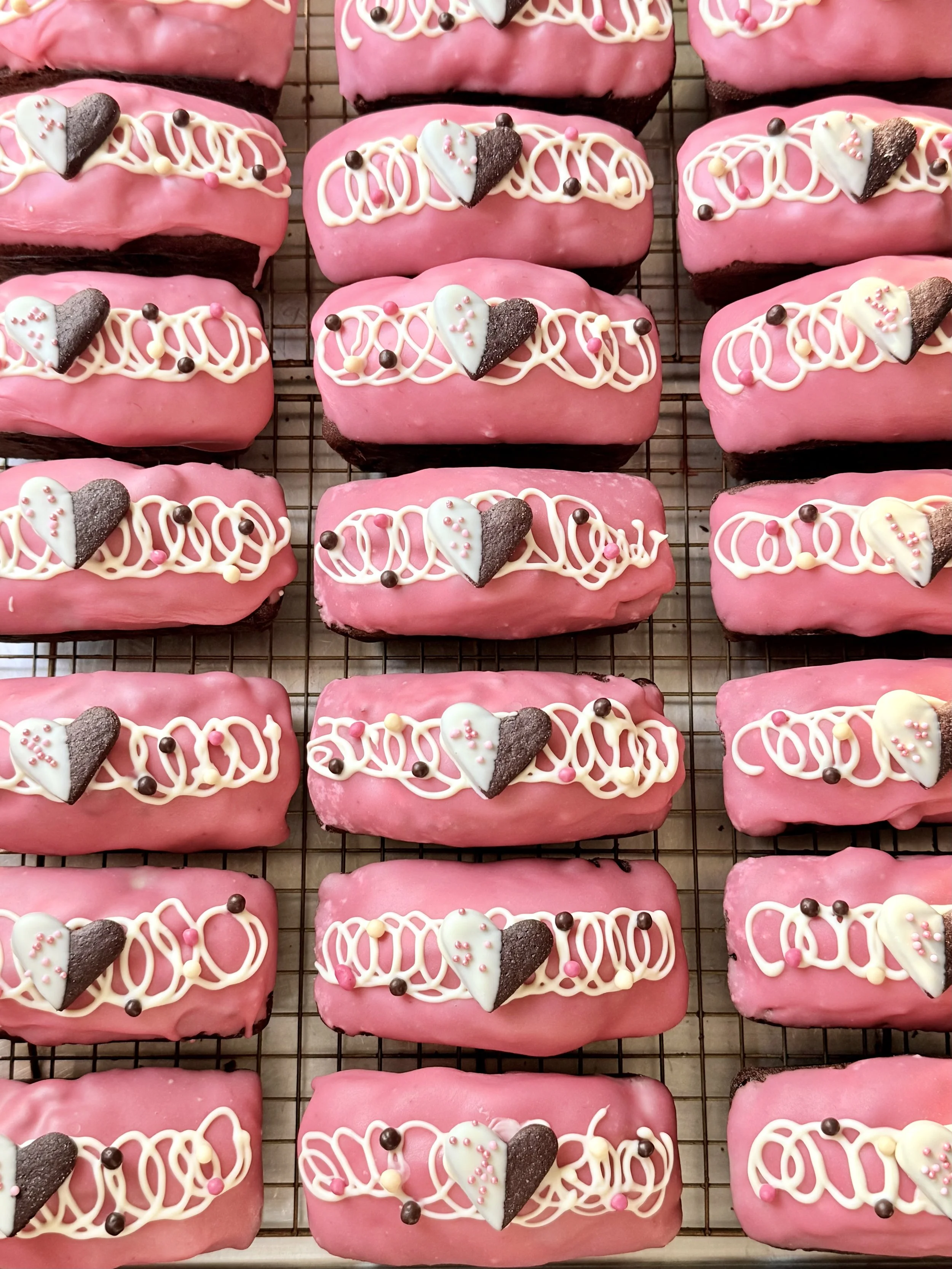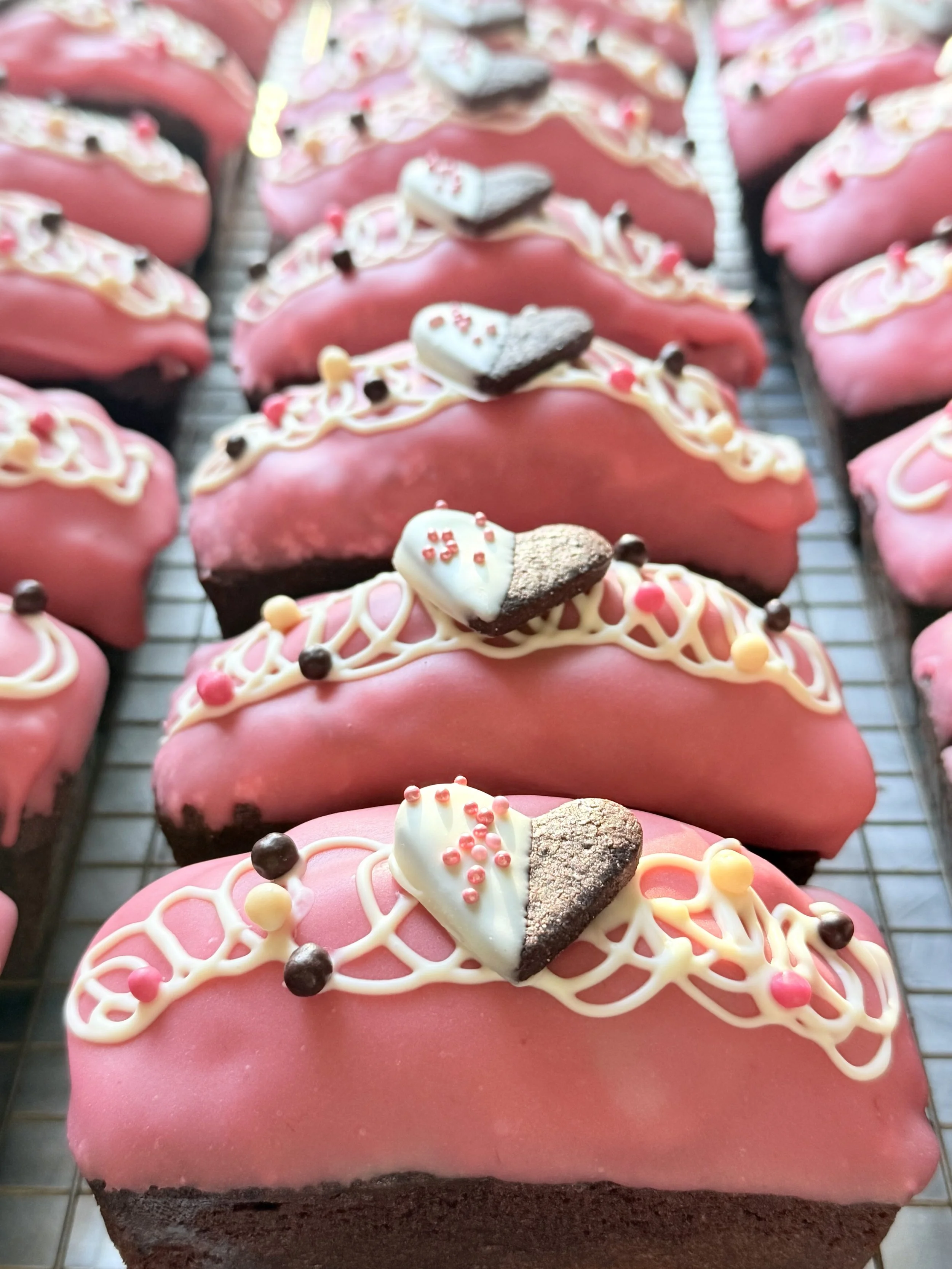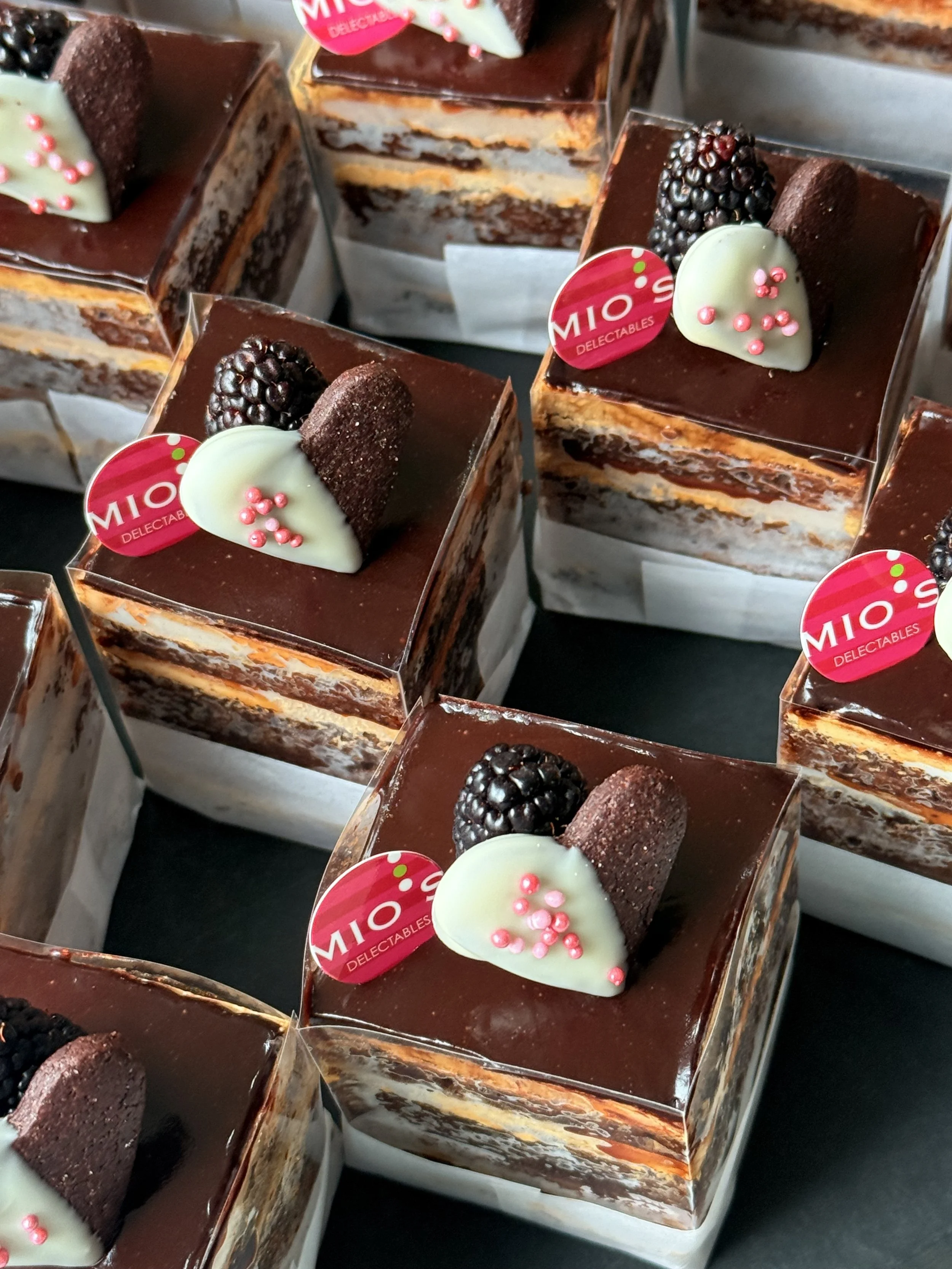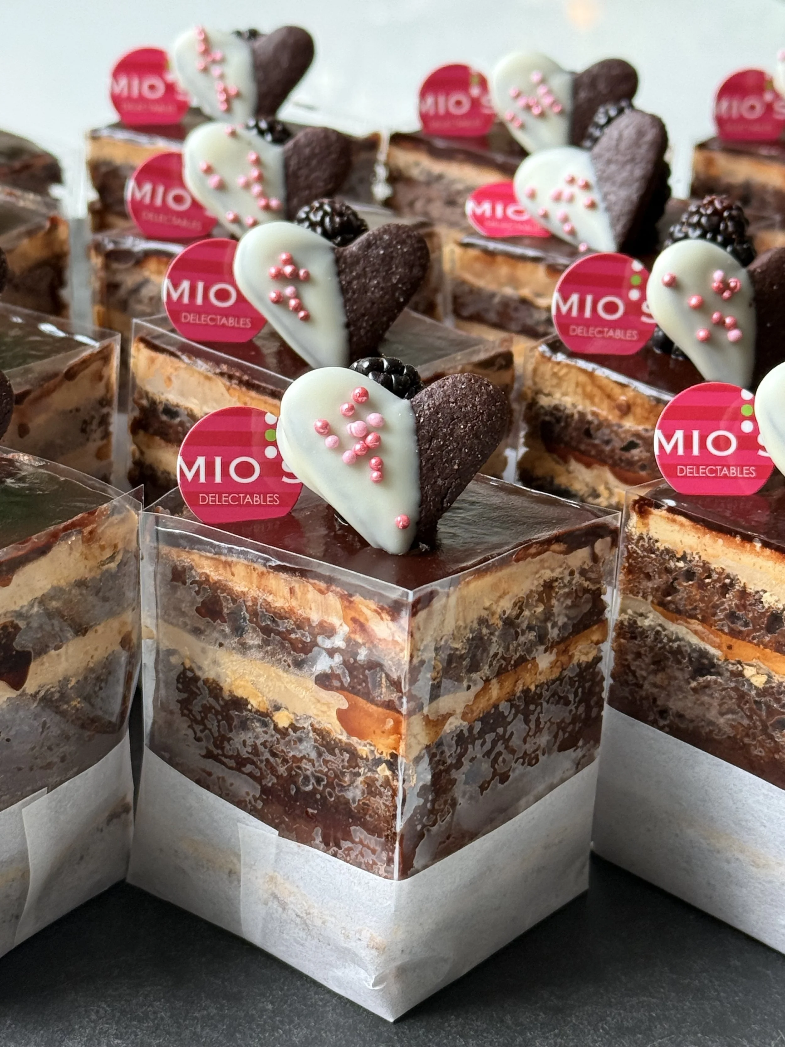 Layers of delicate almond biscuit, rich dark chocolate ganache, and smooth coffee buttercream, made with Mount Hagen organic decaf coffee for a refined, flavorful experience — and finished with a special Valentine’s Day decoration.