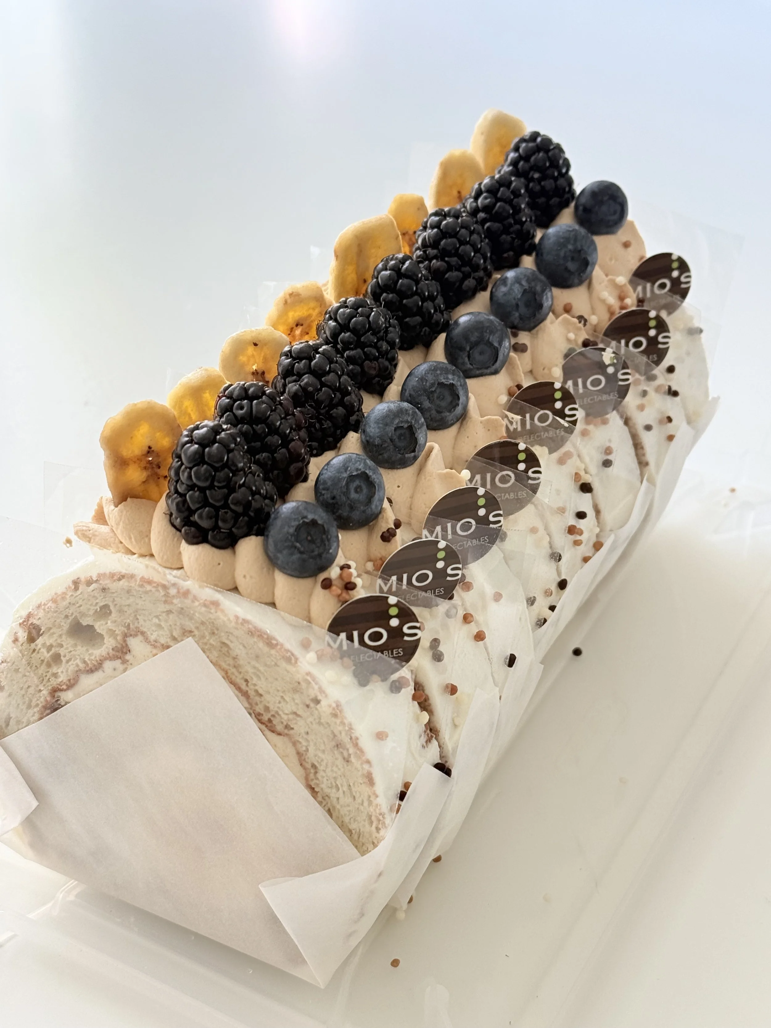 A soft and fluffy matcha sponge roll filled with creamy matcha cream, sweetened azuki beans, vibrant cherry compote, and a touch of zesty yuzu confiture.