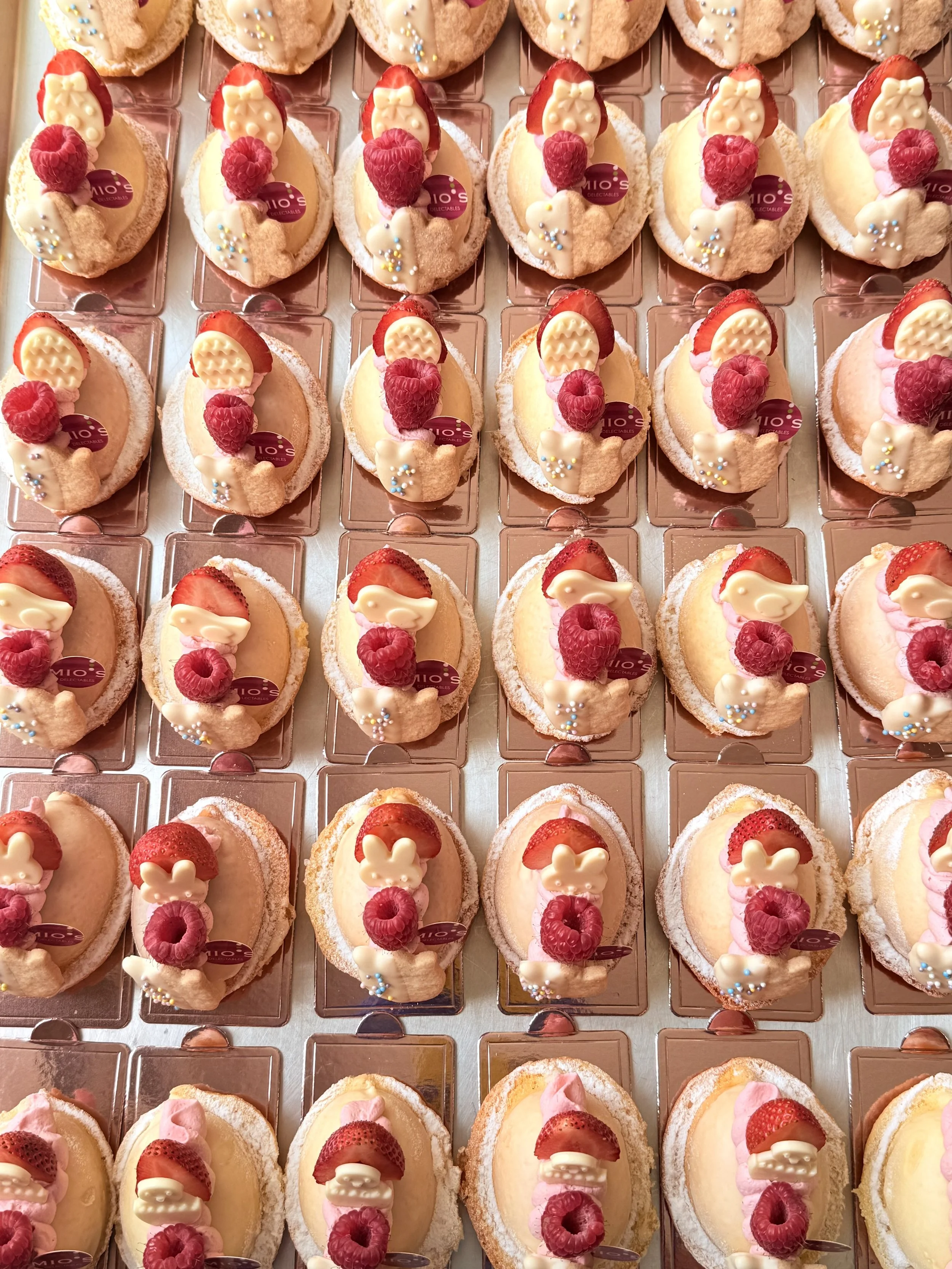 * Fresh Strawberry Custard Tart / Strawberry Pate de Fruit Strawberry Raspberry Ganache, White Chocolate coating